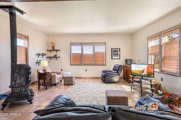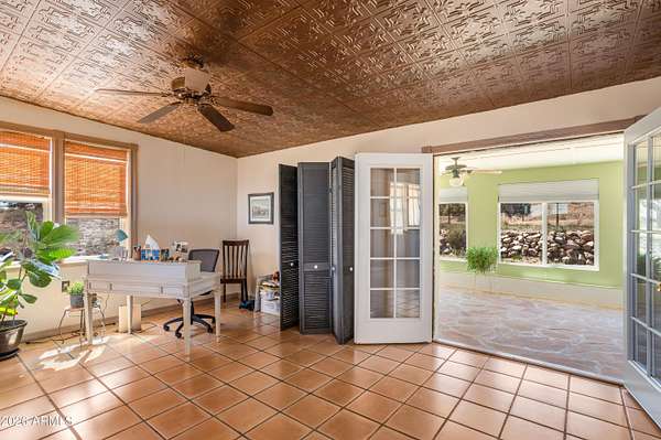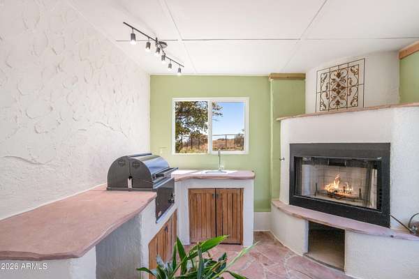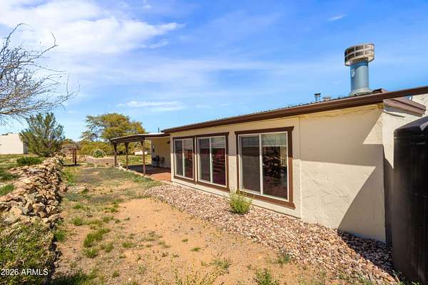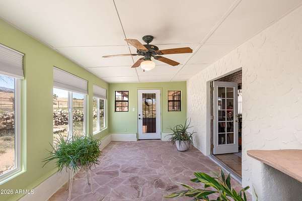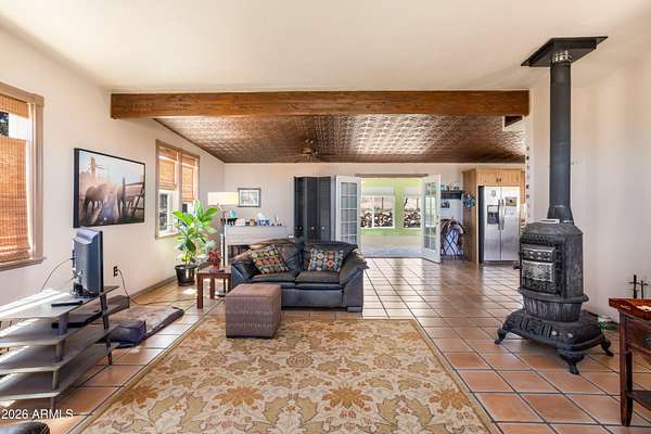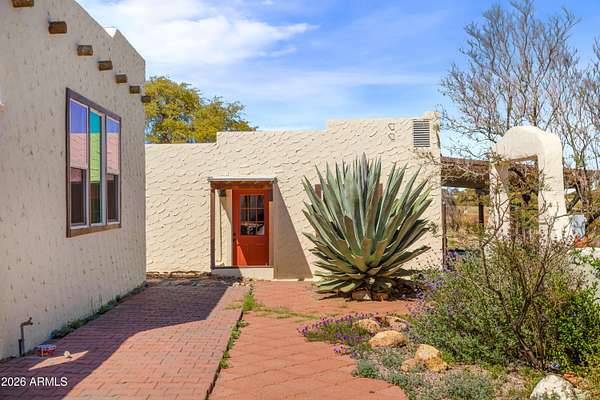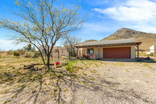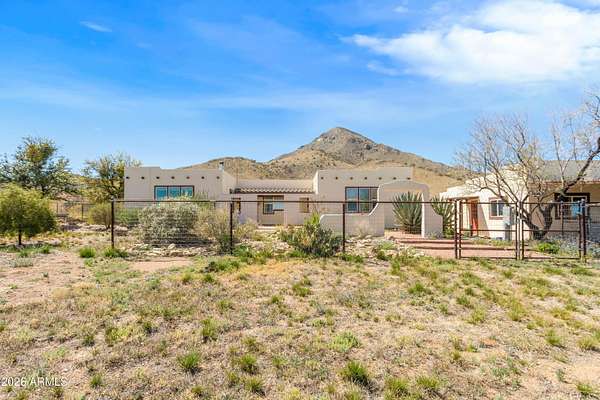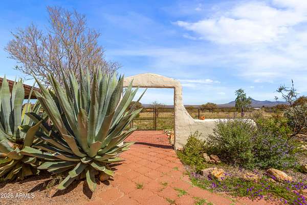 Unique 1bdr/1bath home located on over 15 acres of horse property offering wide open views. Once inside you'll find large open concept living area that connects to a spacious kitchen, both perfect for relaxing and entertaining. French doors off the living room lead to a bright AZ room with a mini-prep area and an inviting fireplace. Out-front take in the view from the large open courtyard with several native plants, while out back you can unwind on the covered patio. A detached garage sits next to the home with a walkway leading to the fenced back yard which includes a shed and horse stall. Entrance to the property is secured with an automatic drive through gate as well as a separate walk-through entry. A rare find, with distinctive features and plenty of charm-this home is one of a