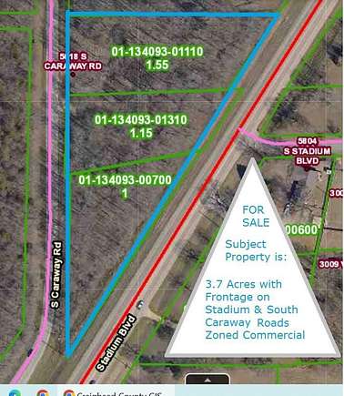 Take Stadium or S. Caraway and drive South until these roads connect. This land Lies between in Stadium and S. Caraway. Excellent Commercial location for many retail uses. Frontage on Both S. Caraway and Stadium Blvd.
