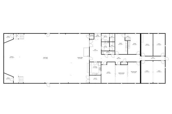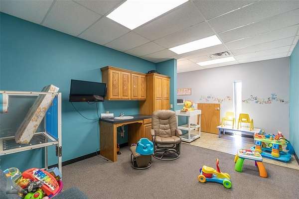 The spacious 4,200 SF sanctuary features tall vaulted ceilings, a raised platform, and acoustical ceiling grid with a mix of recessed and fluorescent lighting. Additional interior features include a foyer, one large fellowship hall (divisible into three classrooms), three dedicated classrooms, two nursery rooms with a shared restroom, a full kitchen, men's and women's restrooms, and multiple storage-mechanical rooms. Flooring consists of commercial-grade carpet and vinyl, with textured and painted concrete block or gypsum walls throughout.