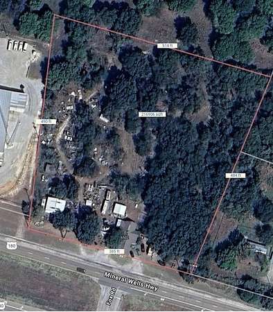 Est $5,626/mo5+- acres on Mineral Wells Hwy 5 miles west of Ric Williamson Loop. This property was used in the part for fruit stand and gas filling station. Present use as residential 3 BR 2 bath dwelling. The property features are Fox Rd cross over directly across from property, a 30x40x10 work shop with electrical 200 amp service and 3 phase available insulated with 2 10x10 overhead doors. 125 ft +- water well with working windmill, all fenced and 2 storage buildings. An excellent location for future commercial use property with 385 foot plus or minus of Hwy 180 frontage.