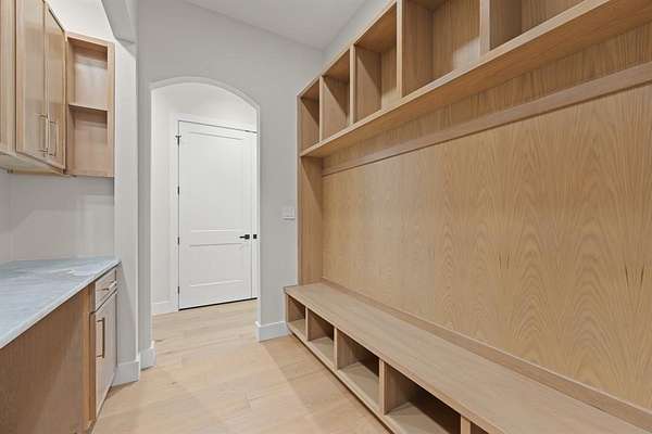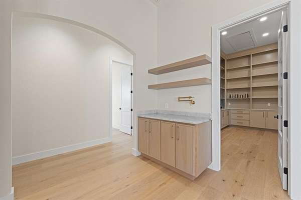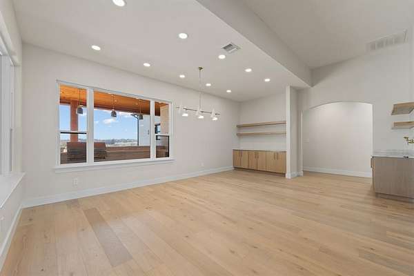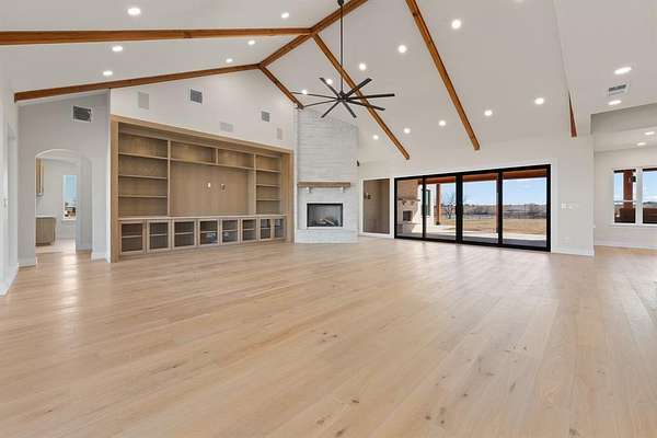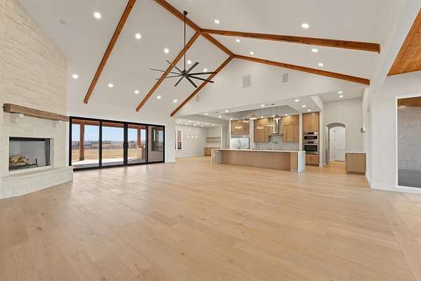 From the moment you arrive, the clean architectural lines, natural stone exterior, and contemporary ranch aesthetic set the tone for what awaits inside. Step into a light-filled interior where soaring ceilings, exposed wood beams, and warm natural finishes create an inviting yet sophisticated atmosphere.