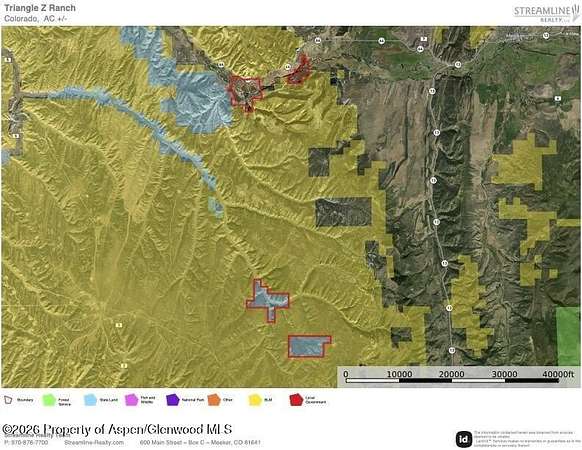 Nestled along the pristine White River just 11 miles west of Meeker, Colorado, the Triangle Z Ranch represents a rare opportunity to acquire a truly legacy-quality Western property in the heart of the White River Valley. Encompassing approximately 50,000 acres of contiguous and controlled land, including approximately 2,100 deeded acres, the Triangle Z Ranch is ideally suited for a premier livestock and recreational operation. With approximately 2,500 AUMs, senior water rights, and a highly functional combination of flood irrigation and center pivots, the ranch supports productive hay meadows and dependable forage and is capable of supporting approximately 450 cow-calf pairs. The thoughtful layout allows cattle to be trailed through a natural grazing rotation, eliminating the need for trailering and significantly reducing labor and operating costs-an increasingly rare and valuable attribute. The ranch features two miles of White River frontage, offering outstanding fly-fishing for rainbow trout and brown trout in a scenic, private setting. The river corridor, irrigated bottoms, benches, and timbered country also provide exceptional wildlife habitat. Hunting opportunities are further enhanced by landlocked access to a substantial expanse of adjacent BLM land, effectively expanding the huntable acreage and creating exceptional big game opportunities. The Triangle Z Ranch consistently supports strong populations of elk, mule deer, mountain lion, black bear, and turkey, making it a true sportsman's paradise. Adding further value and versatility is a commercially permitted gravel pit, providing on-site material for ranch infrastructure and potential supplemental income. Improvements include a shop and tack room, well-suited for equipment storage and ranch operations, along with well-maintained interior roads that provide excellent year-round access across the property. Importantly, the Triangle Z Ranch is not encumbered by any conservation easements, offering maximum flexibility for future ownership, operational decisions, and long-term land use. The Triangle Z Ranch presents an extraordinary combination of scale, senior water, agricultural productivity, recreational excellence, and income-generating assets-ideal for the discerning buyer seeking a premier cattle operation, private sporting ranch, or long-term land investment in one of Colorado's most sought-after ranching regions.