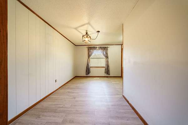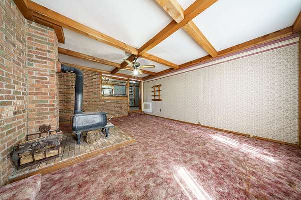 The home features a comfortable layout with an additional den space that includes a wood-burning stove. Step outside and enjoy wide open spaces perfect for gardening, a few animals, or simply relaxing and taking in the quiet setting.