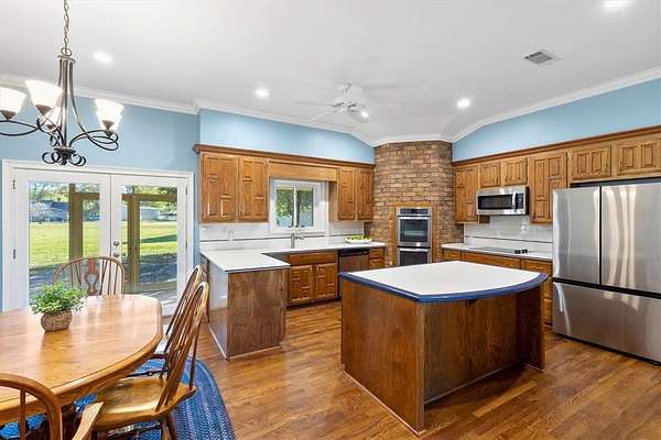 Welcome to this charming country retreat at 6510 Pleasant Valley Place in Sachse, Texas and best of all, NO HOA! Enjoy the ideal blend of peaceful country living with modern convenience, just minutes from the George Bush Turnpike. Set on over 2 acres of tranquil countryside, this property includes a 1,500 sq. ft. detached, 4-car workshop with electricity and generous upstairs storage which is perfect for hobbyists, car enthusiasts, or anyone needing extra space. This meticulously maintained, one-owner home has been thoughtfully designed and lovingly cared for over the years. Inside, you'll find 3 bedrooms, 2.1 baths, and two spacious living areas, plus a 32' x 8' screened-in porch ideal for enjoying sunsets and sweeping views. The chef's kitchen offers stainless steel appliances, an entertainer-friendly island, Corian countertops, and a stylish tile backsplash. Wood floors flow throughout the entry, dining room, kitchen, and breakfast area, adding warmth and character. The main living room features a wall of picture windows that fill the space with natural light, a brick wood-burning fireplace, and a tray ceiling with wood beams. The additional family room off the kitchen boasts a vaulted, beamed ceiling and a convenient half bath. Don't miss your chance to own this affordable slice of Texas country living--complete with modern updates, privacy, and room to breathe!