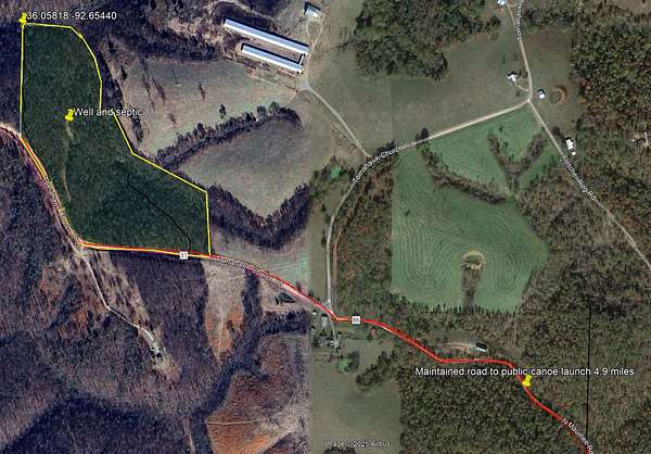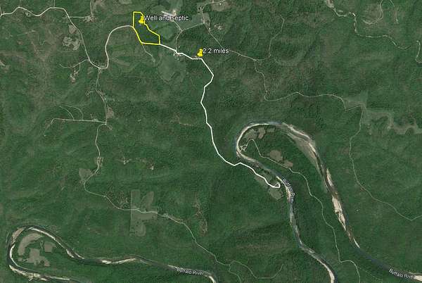 River, a premier choice for canoes and kayaks. The land has 1700 feet of frontage on a Searcy County maintained road with two driveways providing access to the interior of the property. The property is wooded in mostly hardwoods with an abundance of native wild cherry trees which are renowned for furniture making. Whitetail deer and wild turkey are available on this property as well as on the nearby public lands surrounding the river. Electric runs along the road but has also been brought to the interior of the property where there is a new well and a new septic system. Find blackberries, raspberries, wild papaws and a variety of other edible nuts and herbs growing naturally. Property is unrestricted and ready for a homesteader.