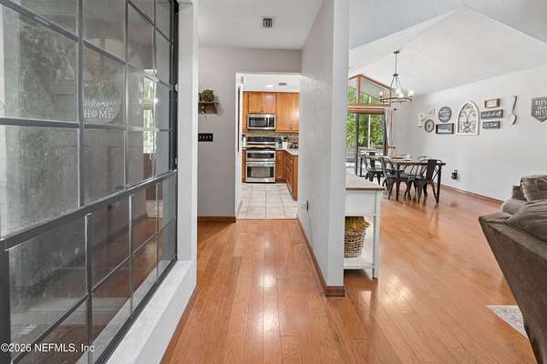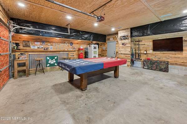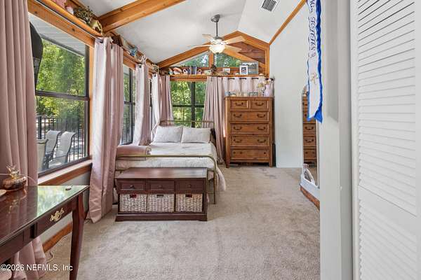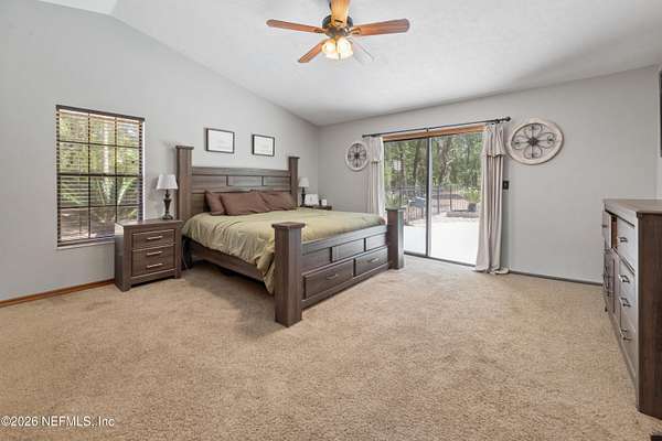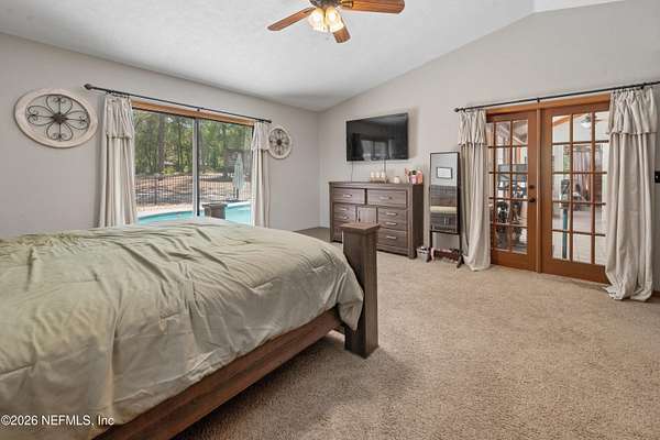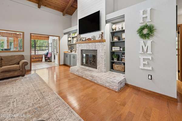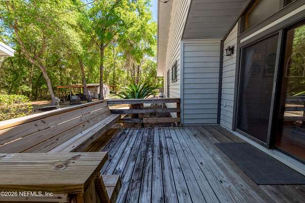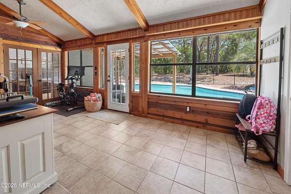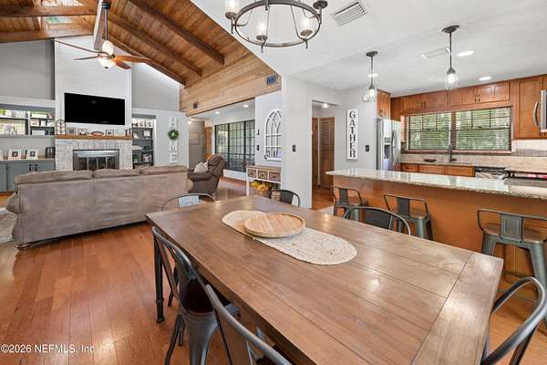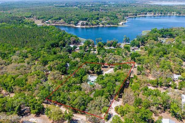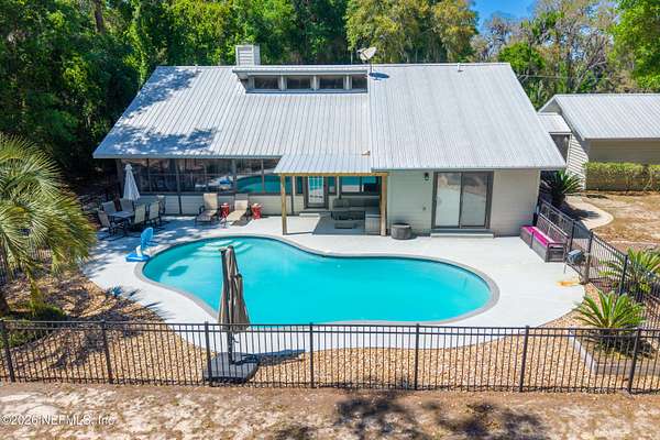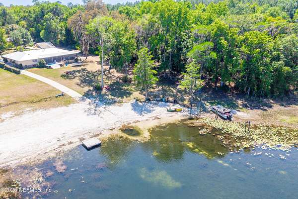 Welcome to your private slice of North Florida living where space and serenity come together on 3 beautiful acres in Melrose, Florida. This well maintained 4 bed, 2 bath home features a split floor plan with over 2100 sq ft of comfortable living space. The living room is stunning with vaulted wood ceilings, tons of natural light, and a cozy fireplace that really gives the home character. The kitchen offers wood cabinets, stainless steel appliances, and bar seating, along with a dining room. The primary suite is spacious and includes a nice bathroom with dual vanities and a tiled walk in shower. A bright sunroom overlooks the pool area, adding extra space and a great spot to relax. Step outside to enjoy the in-ground pool, renovated in 2023, with a mix of open yard and mature trees. The garage features a built-in bar, offering flexibility for a workshop, recreation space, or entertaining space. One of the BIGGEST highlights is the private access to Lily Lake. This spring fed, sandy bottom lake is known for its clear water and is ideal for boating, skiing, kayaking, and fishing. The deeded access is located at the end of the road and offers a quiet setting where you can enjoy the water and the wildlife. If you've been looking for acreage, privacy, and a pool home with character and tons of space, this one is definitely worth the look!!