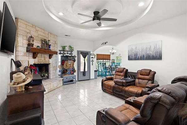 If you're looking for acreage that offers a blend of great location, a place for all of your animals to roam, a beautiful home, and a place for your home business then look no further, you've just found the perfect property! This gem of a property is located very near Hwy 175, within minutes of Wal Mart, the hospital, and the historic downtown square in Kaufman. The 14.07 acres is fully fenced with a gated entry, has a barn with stalls and a tack room, a loafing shed, a round pen, workshops, hobby shops, dog runs, a pond, & it is Ag Exempt. There's a one car garage with 2 bays, and above the garage is the most amazing entertainment area, perfect for hosting any type of function - birthday parties, weddings, or just plain sunset watching. The possibilities for this area are endless. The home is tiled throughout, and the gray accent paint is stunning. When touring the home, make sure to look up, the ceilings in the living room and master bedroom are unique, and add a definite wow factor. The stone fireplace and wood mantel in the living area make for the perfect cozy night at home. After a long day of work, head to the master bathroom to take a relaxing bath in the jetted tub. It's your own private resort in the privacy of your own home. This is a must see. This property won't last long, so schedule your tour today.