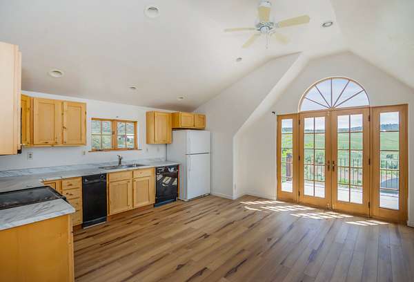 This charming 612-square-foot residence features 1 bedroom and 1 bathroom, with a recently renovated interior providing modern comfort. Set just below a scenic cedar ridge, the home overlooks an irrigated meadow, providing picturesque views. Below the living space, a spacious 3-door garage offers ample room for storage.