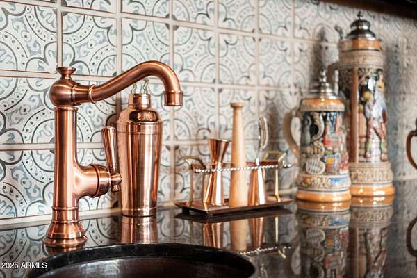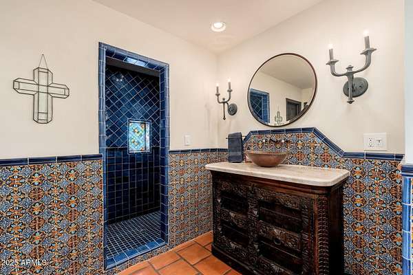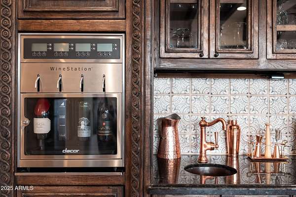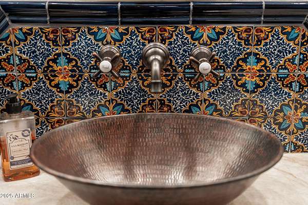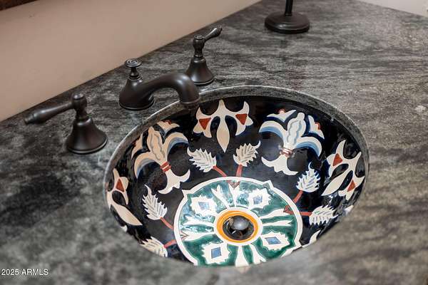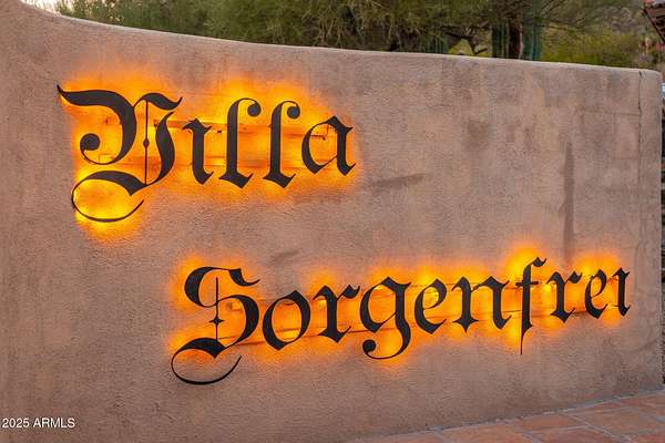 Welcome to Villa Sorgenfrei. Perched high in Carefree's exclusive mountain preserve, this gated Spanish-inspired estate captures breathtaking panoramic views of the Valley. Completely remodeled in 2018-19 with an impressive attention to detail. This home sits on approx. 2 acres and is a showcase of handcrafted artisan details - from rich custom carved wood doors, mantles, bar to authentic hand painted tiles - blending timeless elegance with modern comforts. The home's Smart Automation System has been upgraded with an advanced RTI Lutron Lighting System. A separate 968 sq ft Guest House offers a private one-bedroom retreat with its own full kitchen, fireplace, garage, terrace, and sweeping views - perfect for visitors or extended stays. Designed for entertaining, the chef's kitchen showcases Gaggenau and Dacor appliances, copper sinks and fixtures, hand-painted tile backsplash, and a charming sitting nook - complete with a convection/steam oven, warming drawers and a built-in Gaggenau automated espresso maker for the perfect cup anytime.