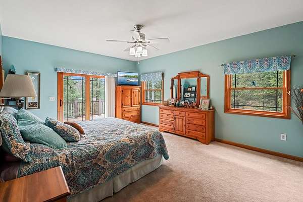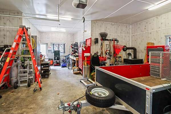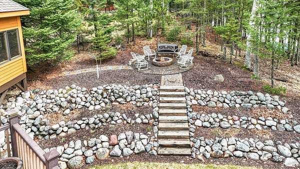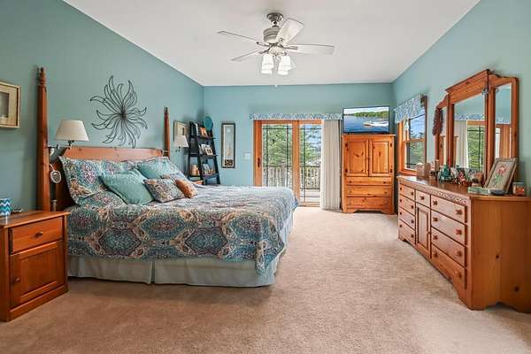A rare opportunity on sought-after Tom Doyle Lake, this luxury lakefront retreat is beautifully maintained and thoughtfully designed, offering the perfect blend of comfort and low-maintenance living on a full recreation lake with pristine sandy frontage. The home features a warm, inviting interior with cathedral windows filling the living space with natural light and showcasing the peaceful setting. The main level includes a spacious primary suite, first-floor laundry, and attached garage. The walkout lower level with 9-foot ceilings offers bright additional living space with a bar, perfect for entertaining. Built with Smart siding, composite decking, and quality finishes throughout. Outside, enjoy landscaped grounds, gazebo, fire pit, fenced yard, outdoor kitchen with built-in grill, and a gentle slope to the water. Bonus oversized toy garage for boats, vehicles, and workshop. Homes like this rarely come available.