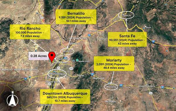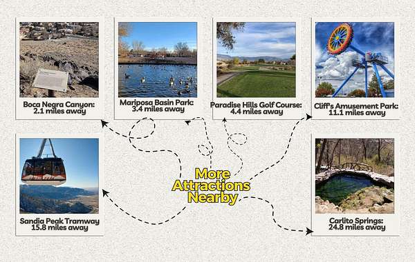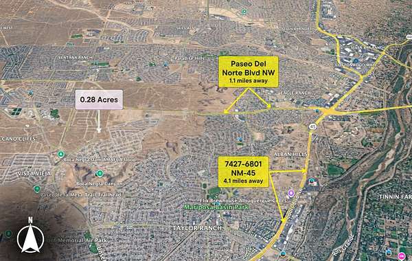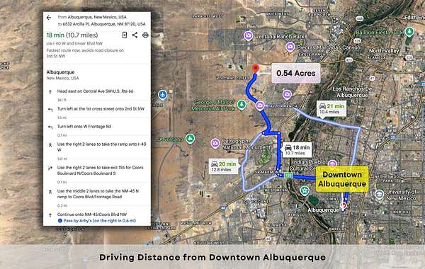 From Albuquerque City Hall at 1 Civic Plaza NW, head west on Marquette Avenue toward 3rd Street, then turn right onto 3rd Street NW. Merge onto I-40 West via the on-ramp toward Gallup and continue for about 7 miles. Take Exit 154 for Unser Boulevard and turn right onto Unser Blvd NW. Drive north for roughly 3.5 miles, then turn right onto Kimmick Drive NW. Continue for a short distance, then turn left onto Vista Vieja Avenue NW, followed by a right onto Arcilla Place NW. To 6532 Arcilla.