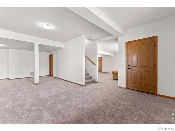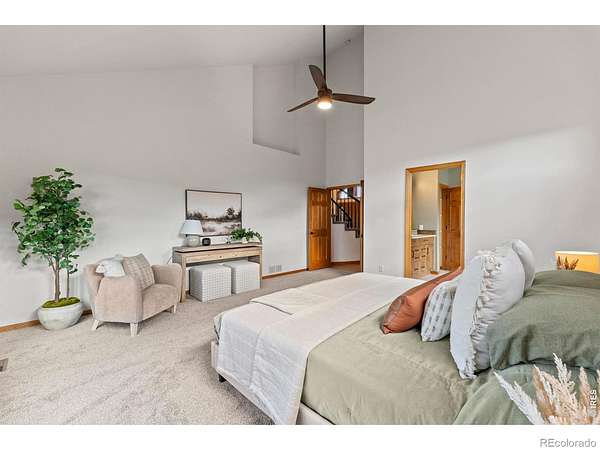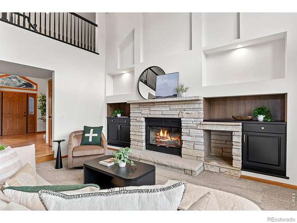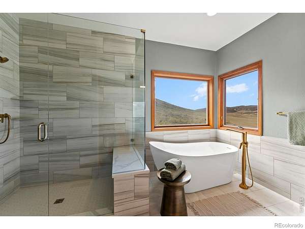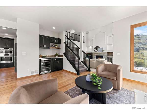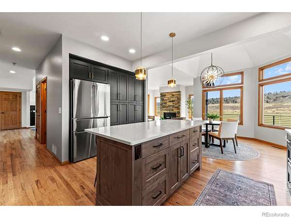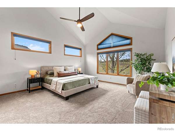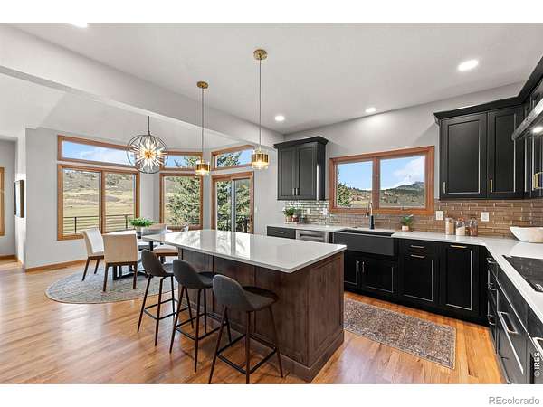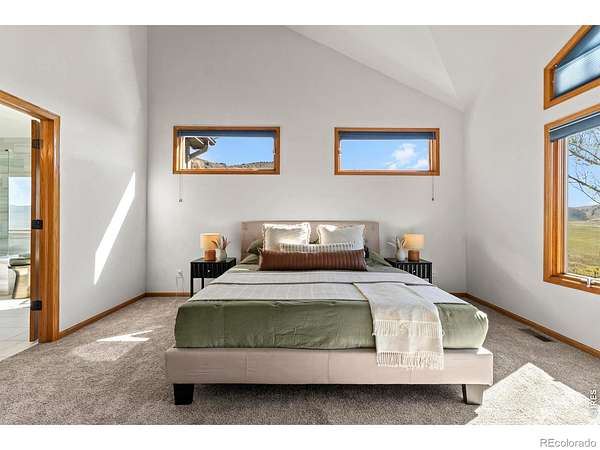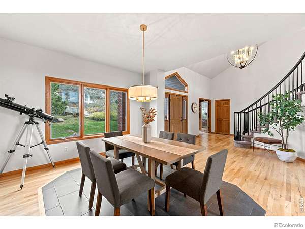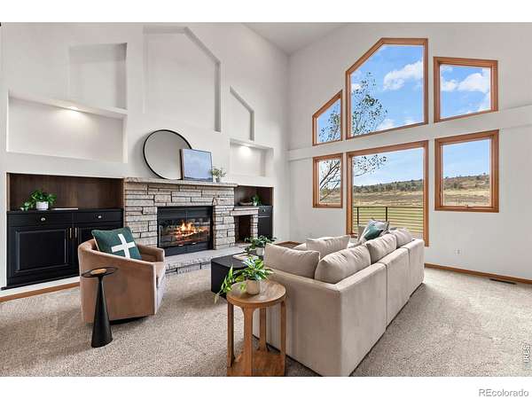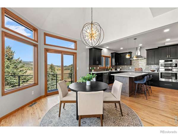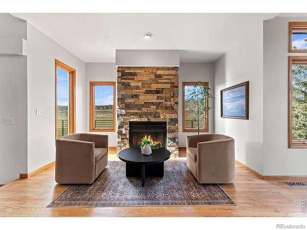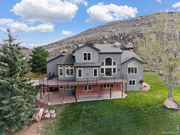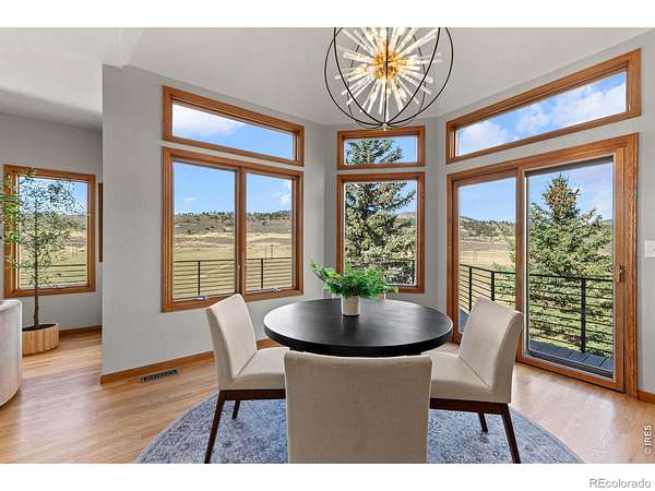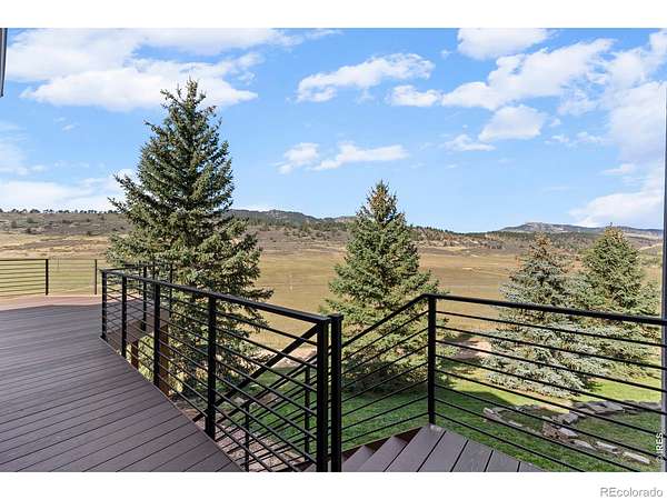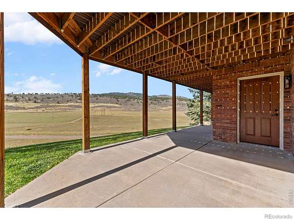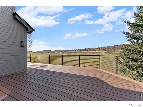 Experience a truly exceptional foothills retreat set on 35 private acres just west of Fort Collins, offering sweeping panoramic views and unmatched serenity near Horsetooth Reservoir. Surrounded by protected open space and conservation easements, this property delivers privacy, luxury, and Colorado beauty. The freshly remodeled 4-bedroom custom home is designed to capture breathtaking views from nearly every window. A grand entry welcomes you inside, where newly refinished wood floors flow throughout the main level. A cozy den with a gas fireplace and built-in shelving provides a quiet escape, while the large living room impresses with soaring ceilings, a natural stone wood-burning fireplace, and elegant built-ins. Entertain in the formal dining room, which connects seamlessly to the beautifully updated gourmet kitchen. Featuring custom cabinetry, quartz countertops, a contrasting center island, new stainless steel appliances, and a pantry, this space is stylish and functional. The informal dining area and hearth room offer a second gas fireplace with natural stone accents-perfect for everyday living. The main-level primary suite is a retreat, complete with a spacious bedroom and a newly remodeled five-piece bath featuring heated floors and a generous walk-in closet. Upstairs, one of two staircases leads to two more bedrooms and a full bathroom. The walkout basement expands your living space even further with a large recreation room, a family room, an additional bedroom, a 3/4 bath, and storage. Step outside to a massive new deck overlooking the valley, where you can take in stunning views and even catch a glimpse of Horsetooth Reservoir. Recent upgrades include a new roof, HVAC system, water softener, carpet, and lighting. Completing the property is a three-car garage with a substantial storage room above. This is a rare opportunity to enjoy tranquil foothills living just minutes from Fort Collins in a truly remarkable mountain-view home.