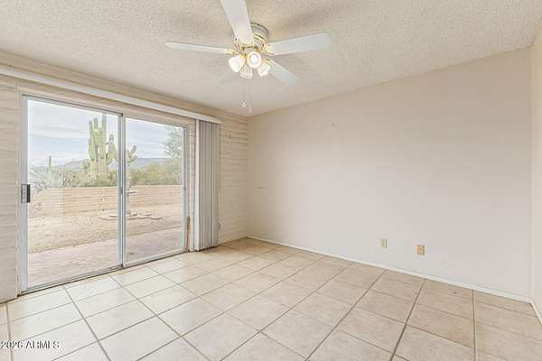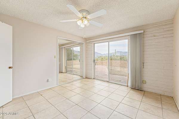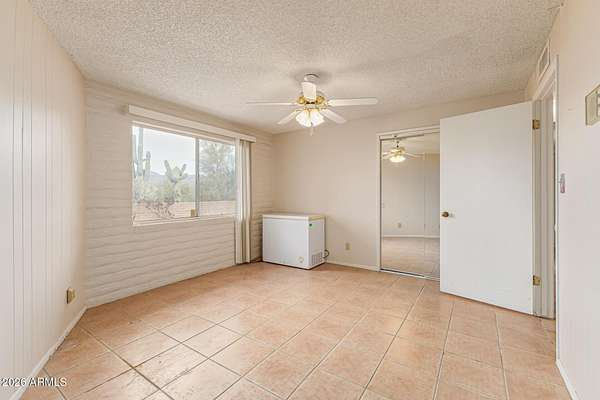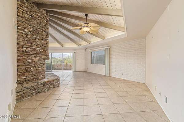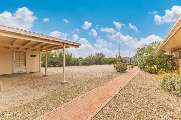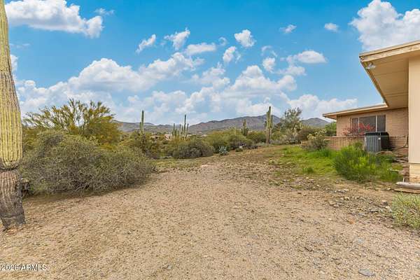 Enjoy the stunning mountain views surrounding Cave Creek, including Elephant Mountain, from this beautiful 3-bed, 2-bath home on a 1.7-acre horse property. Plenty of room for animals, toys, storage, and projects. The interior features tile floors, soaring ceilings with exposed beams, a dramatic floor-to-ceiling stone fireplace, abundant natural light, and earthy tones throughout. The galley kitchen offers white cabinetry, granite countertops, and essential appliances. The primary suite includes dual sinks, double mirrored closets, and private patio access. Step outside to an expansive covered patio with pavers and amazing mountain views-perfect for relaxing or entertaining. This home is a blank canvas - ready for your personal touches and updates to truly make it your own! backdrop for your gatherings and relaxing evenings. This home is a DREAM! Don't miss it!
