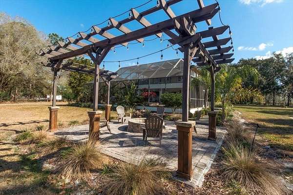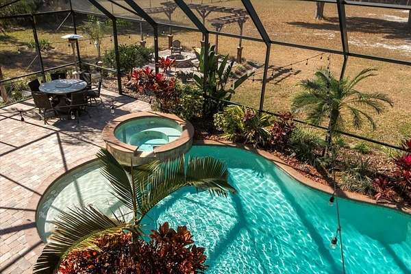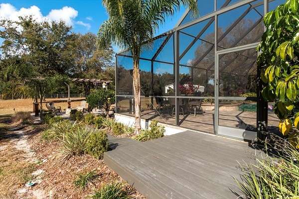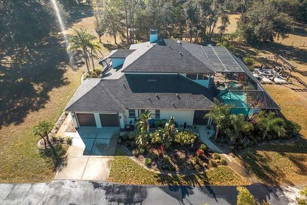 Experience the ultimate in Florida living at this exceptional 5-bedroom, 2.5-bath estate set on two private, tree-lined acres in Land O' Lakes. Enter through a gated drive and be welcomed by mature oak trees, manicured landscaping, and a freshly painted exterior (2025) that enhances the home's stately presence. Inside, sun-filled living spaces showcase elegant crown molding, gleaming hardwood floors, and plantation shutters in the living and dining rooms. The chef's kitchen features granite countertops, stainless steel appliances, and a center island ideal for entertaining. The main-level primary suite offers a peaceful retreat with a spa-like bath, soaking tub, and walk-in shower. Upstairs, additional spacious bedrooms offer generous layouts and walk-in closets, with two opening to a grand balcony under the screened enclosure. Step outside to your private backyard oasis with a two-level screened lanai, sparkling pool and spa, pergola, and stone fire pit--perfect for relaxing or hosting gatherings. Additional highlights include a two-car garage, oversized workshop, storm-proof Pella sliding glass door (2022), roof replaced in 2020, and two Rheem A/C systems installed in 2024 and under warranty. Ideally located just 20 miles from Tampa, with easy access to shopping, dining, parks, and outdoor recreation--this home offers luxury, privacy, and convenience all in one