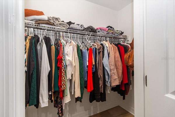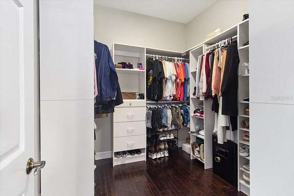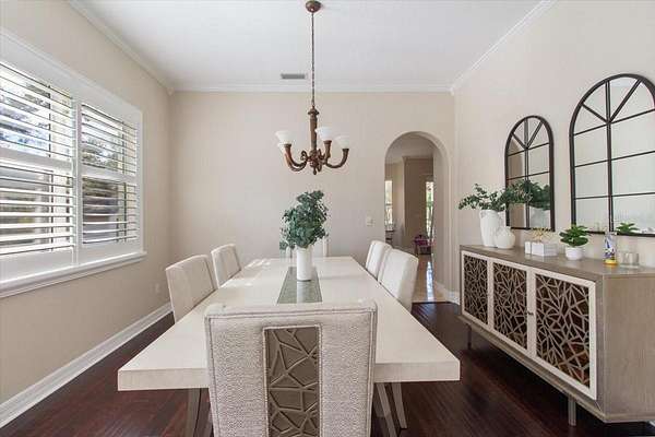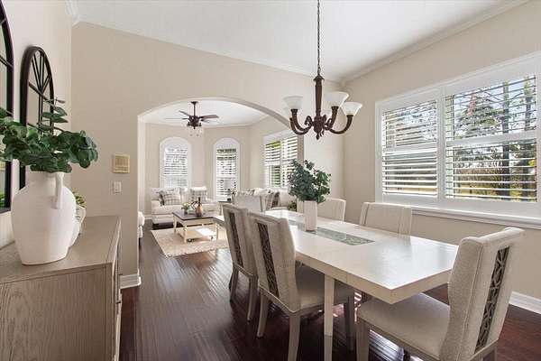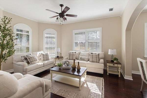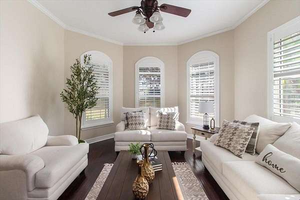 - Built-In Features, Ceiling Fans(s), Crown Molding, Primary Bedroom Main Floor, Solid Surface Counters, Solid Wood Cabinets, Thermostat, Walk-In Closet(s), Window Treatments