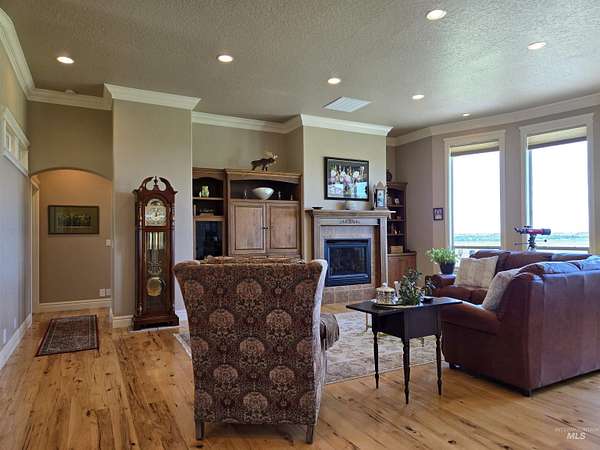 What an amazing View! This home is gorgeous inside and out. Custom Built home sitting in the middle of this acreage. Enter into a beautifully finished home with wood flooring, amazing arches and built in custom book cases and shelving. Split bedroom floor plan, formal dining room, den/ office, powder room for guests and a very large utility / mud room. Kithen has center island and breakfast bar for tons of countertop surfaces. The finishes here are timeless and will be a home that you will love. Views from almost every room in the home. Sit on your back patio in the evening and enjoy a nice shaded east facing yard. Have your morning coffee and enjoy the sunrise. All while watching the neighboring farms grow crops. This is such a peaceful location. Room for the dream shop, horse pasture, pool or whatever is on your wishlist. Come to your new location in the country. Irrigated ground with main line and all set up for watering.