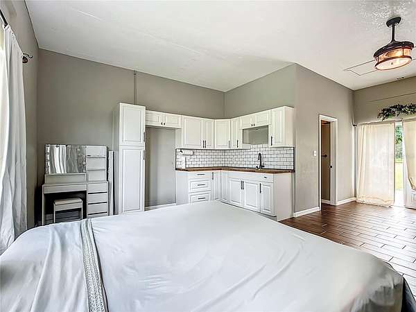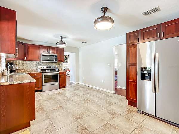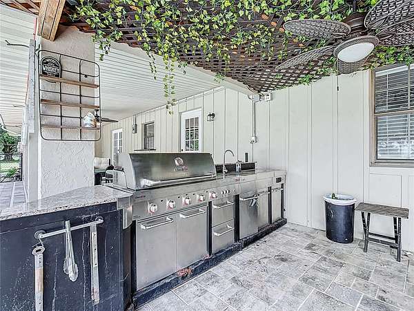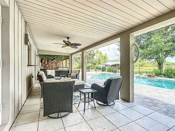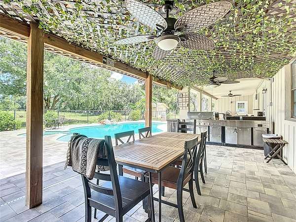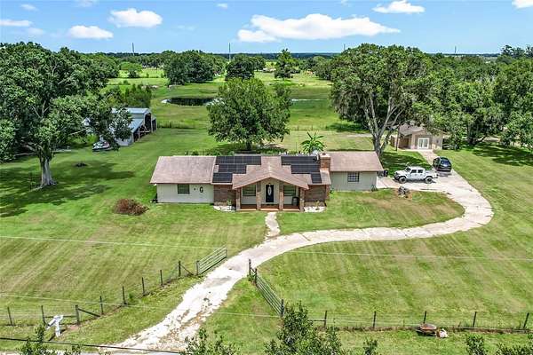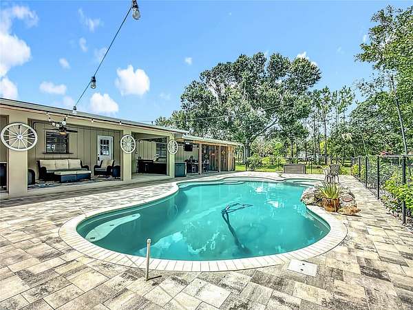 This 3 bedroom, 2 bath home home sits on 5 fully fenced acres and offers the perfect blend of comfort, luxury, and outdoor living. The home boasts over 1800 sq ft of living area , a side entry 2 car garage and tons of updates. Step inside to find ceramic tile and laminate floors throughout, a cozy living room with a wood burning fireplace and a full sized dining room, perfect for gatherings. The bathrooms feature tiled walk in showers and the spacious primary suite offers a large walk in closet. The open kitchen has tiled backsplash, stainless steel appliances and updated cabinetry with soft close doors/drawers. Enjoy a fabulous outdoor entertaining area complete with a tiled sitting area, paver dining area and outdoor kitchen. The sparkling saltwater pool features a moon-dusted finish, propane-heated hot tub, paver deck area and a fence enclosure for safety. Plumbing is already in place for future water features like a waterfall or slide. The pool deck already has a footer all the way around in case someone wants to add a screen enclosure in the future. The pool bath, equipped with a commode and shower, makes it convenient for all of your pool parties. There is a paver walkway from the driveway to the pool area as well. The fire pit area has pavers and is ready for you to enjoy evenings under the stars. There is a 4 bay pole barn. One of the bays is tall enough to park a large boat or RV. This pole barn also houses a workshop area. The tiny home would make a perfect in law suite. It is a studio style up. The kitchen area has tile backsplash and butcher block countertops. The bath features a tiled shower and built ins for a closet. This home is perfect for nature lovers. The stocked pond is great for fishing and recently a variety of ducks have been seen swimming on the pond. The septic has recently been pumped, the solar panels are 3 years old and the roof is approximately 6 years old. Brand new AC. Located in an area with an A-rated elementary school for the past 3 years, this property is as practical as it is beautiful. If you have been looking for acreage with modern amenities, guest accommodations, outdoor entertaining area and a workshop, this is the one! Plenty of room for all of your animals and your toys!! This property was originally 10 acres. Seller is open to selling it as the total 10 acres (with a building on the back 5 acres) for an additional price. Reach out for details.
