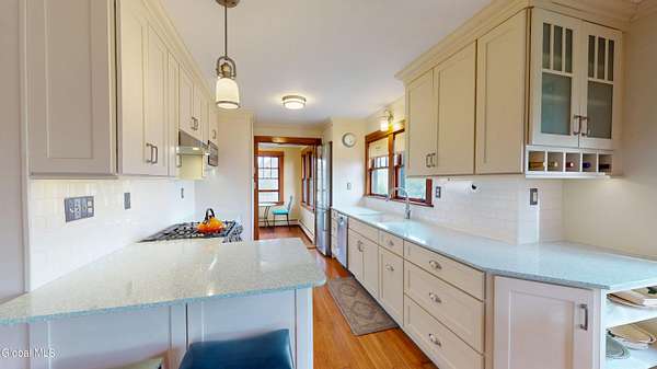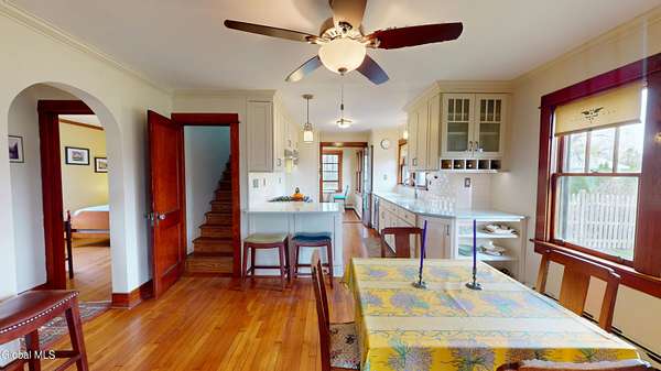 This beautifully restored Craftsman-style home in the northern Hudson Valley blends timeless character with thoughtful updates. Featuring 3 bedrooms and 2 bathrooms, the home showcases original windows, hardwood floors, and finely detailed window trims that have been meticulously preserved, maintaining its authentic charm. Natural light fills the interior, enhancing the warm, inviting atmosphere throughout. The updated kitchen complements the home's retro-chic aesthetic, offering both style and functionality for everyday living and entertaining. Each room reflects a careful balance of historic craftsmanship and modern comfort. Step outside and enjoy a peaceful year-round waterway, meandering landscape surrounded by mature plantings, including azaleas, daylilies, rosa rugosa, redbud crabapple trees, firethorns, arborvitae, cypress, hydrangeas, iris, and spring bulbs like daffodils. A flagstone patio provides the perfect spot to relax while observing eastern bluebirds, tree swallows, barn swallows, and eastern phoebes nesting nearby. Set on a generous parcel, this property offers privacy and natural beauty while remaining conveniently close to major transit, local attractions, and charming boutique shops.