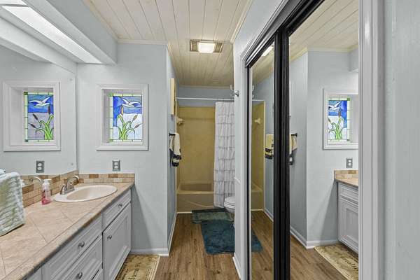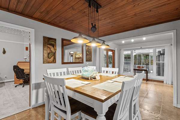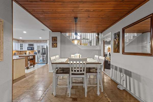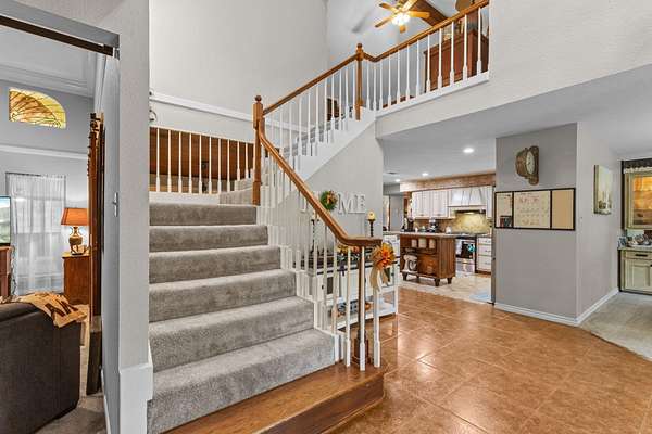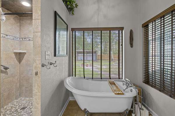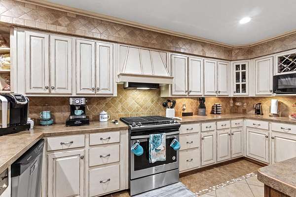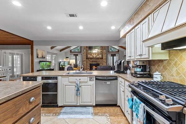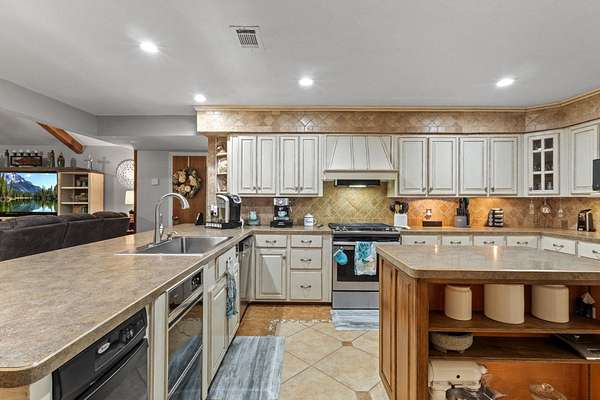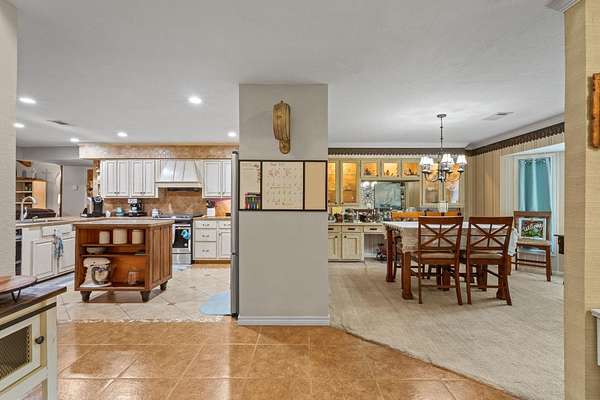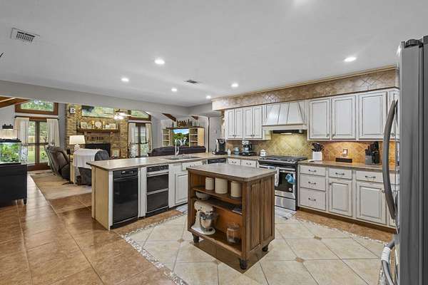 - Blinds/Shades, Ceiling Fan(s), Free Standing Range, Garbage Disposal, Gas Stove, Inside Utility Room, Island Work Center, Open Concept, Pantry, Primary Bedroom Down, Self-Clean Oven, Sheetrock, Skylight, Tile Floors, Vent Fan