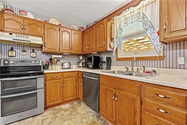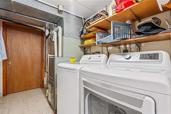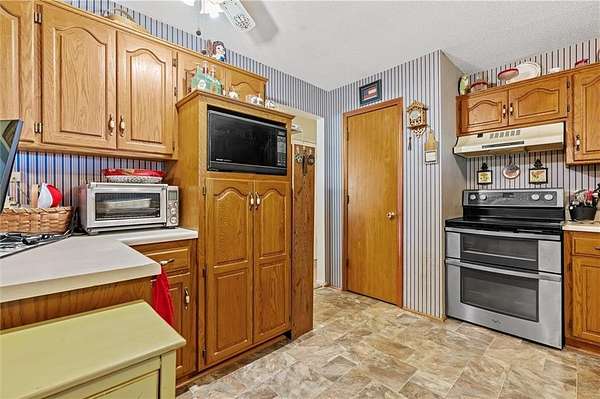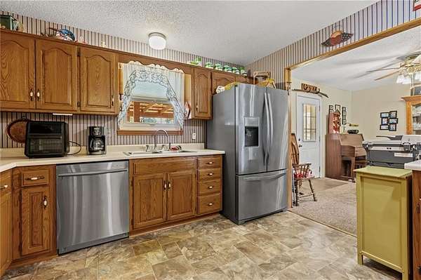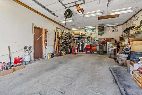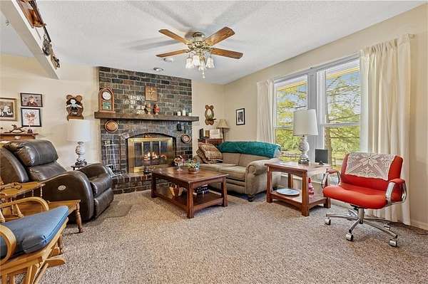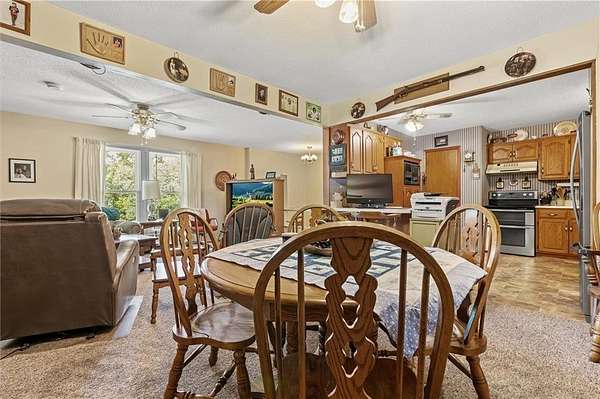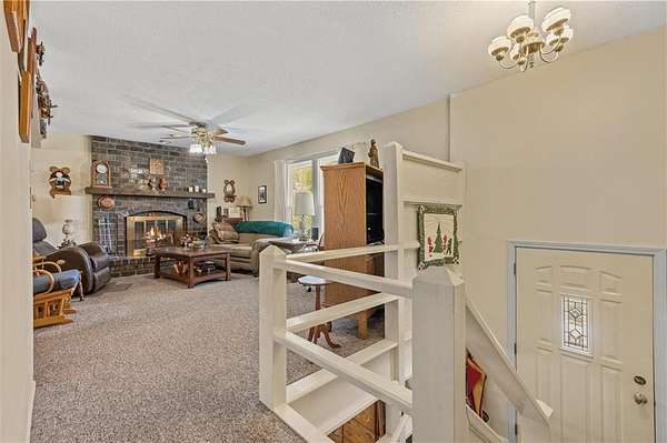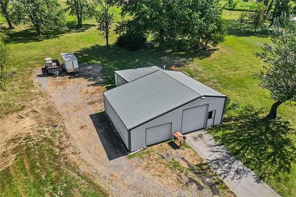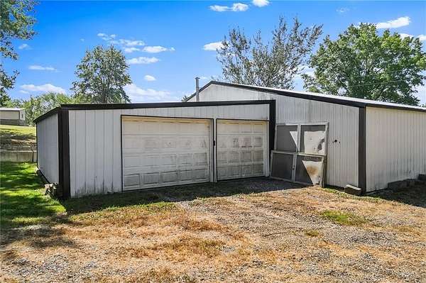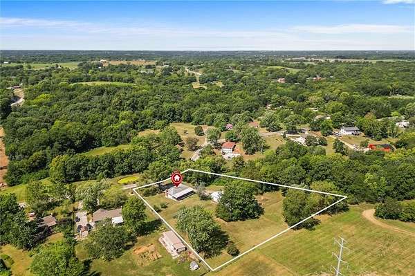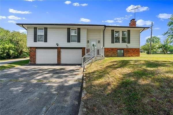 Welcome to this well-cared for one owner home of 48 years, offering comfort, space, and a lot of privacy just minutes from I-35 and within the sought-after Kearney School District. Sitting on 2.1 acres, this property is a rare find, featuring a large multi bay shop with an attached storage building, perfect for hobbyists, car enthusiasts, or extra storage needs. Inside, you'll find a spacious floor plan highlighted by a large living room with a cozy fireplace, a dedicated dining room, and a generously sized kitchen with abundant cabinet space. The primary suite includes a full bath, while two additional bedrooms and another full bath are located down the hall. The finished lower level expands your living space with a second fireplace, a large half bath, utility room, and two separate access points to the oversized 2 car garage. Step outside and enjoy the very large covered porch that spans the entire back of the home, the perfect spot for relaxing or entertaining while taking in the peaceful surroundings.