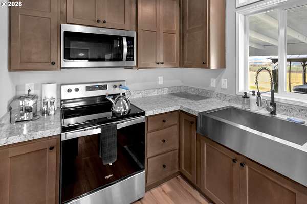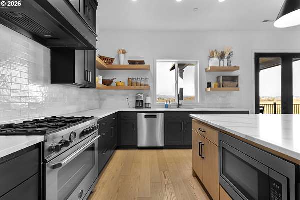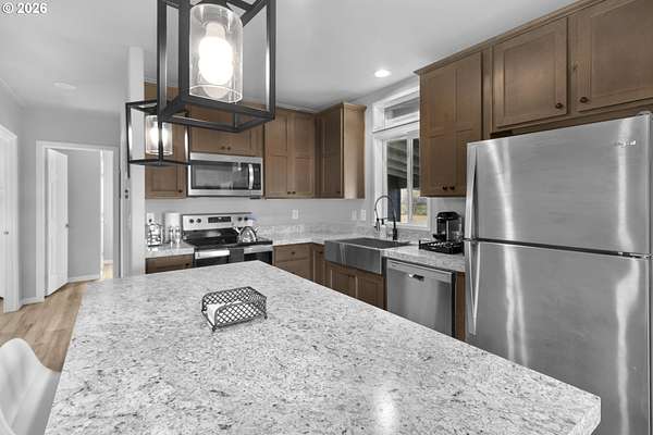 - Builtin Range, Dishwasher, Free Standing Refrigerator, Gas Appliances, Island, Microwave, Pantry, Quartz, Stainless Steel Appliance