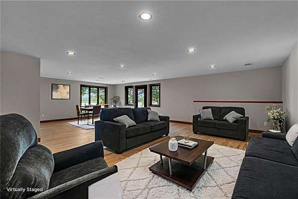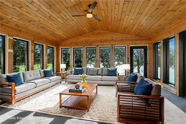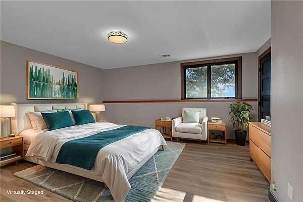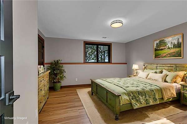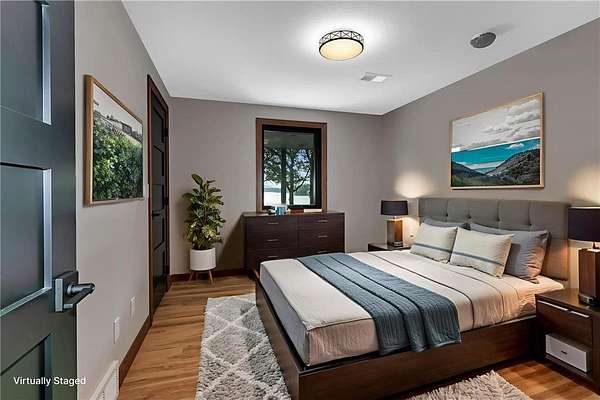 Inside, you’ll find 5 bedrooms, 4 bathrooms, and two private bedroom suites. The open-concept main floor features a custom kitchen with granite countertops and stainless steel appliances, a lake-facing sunroom, and a cozy living room gas fireplace. Immense natural light pours in through large windows, creating an inviting atmosphere throughout. A walkout basement with a concrete safe room, generous storage, and its own laundry adds both comfort and security. A second laundry room is located on the main floor for convenience.