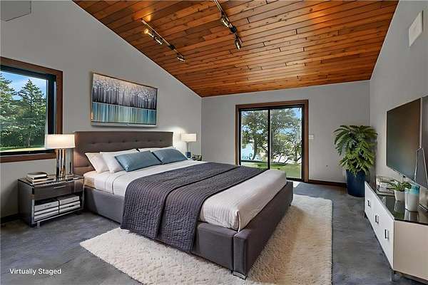 Outdoors, the property is enhanced by boulder retaining walls, manicured trees, and updated landscaping. Two impressive outbuildings provide endless possibilities: a 40' x 90' building with new steel and a 72' x 65' concrete-floored building. (Insulating and lining the two sheds can be negotiated). On the shoreline, enjoy your private boat landing and boat house—ideal for lakeside living and recreation.
