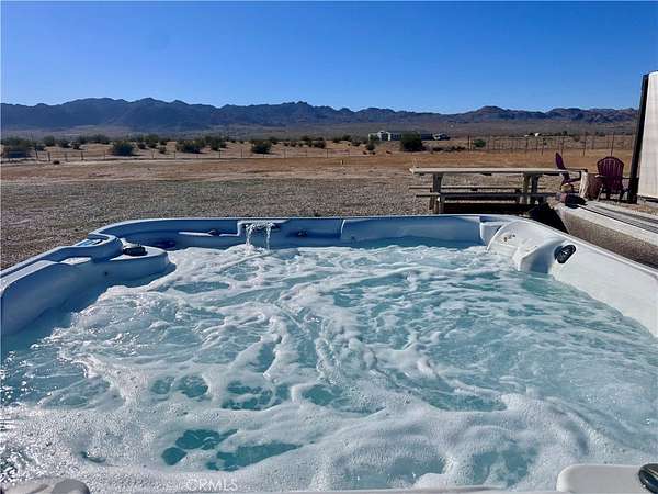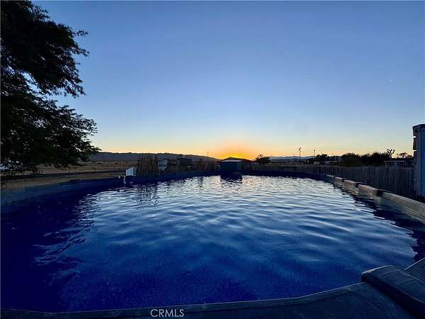 Fully fenced, divided into sections: front 1.25-acre with half-circle gravel driveway, dual gates, mature landscaping (50-70-yr Joshua trees, cacti, Mesquite for shade/wildlife). Rear: 30x15 ft covered patio, above-ground pool (new filter/pump/liner), hot tub, built-in bar on 20x20 ft slab, utility shed.