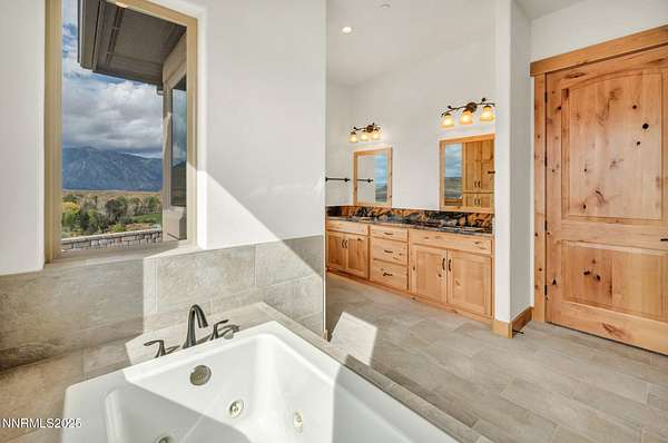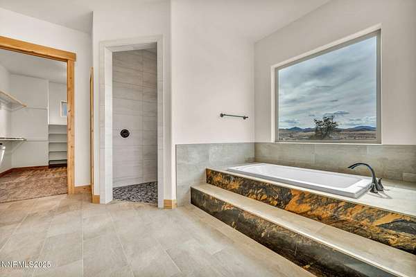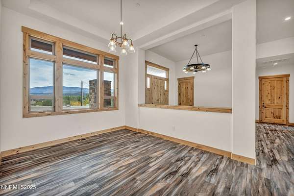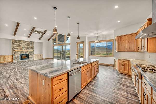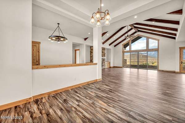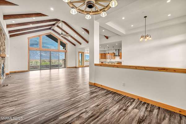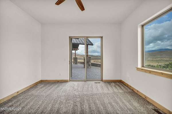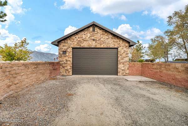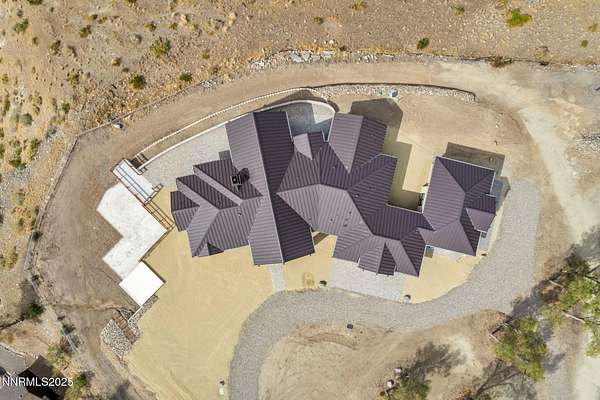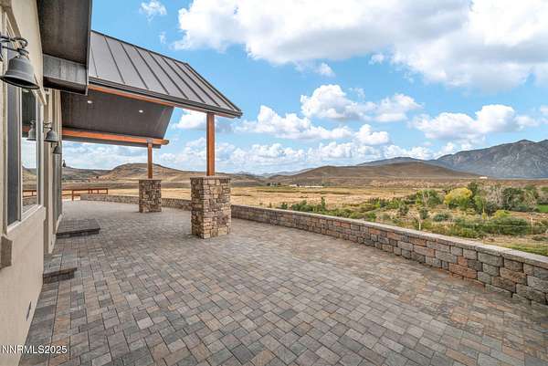 Stunning Custom Ranch-Style Home with Panoramic Sierra Views Perched above the valley on 1.75 acres, this beautifully designed custom ranch-style home offers 3,452 sq. ft. of luxurious single-level living with breathtaking views of the Sierra Nevada Mountains and Carson River below. The heart of the home is the expansive great room, featuring vaulted beam ceilings and a striking stone fireplace. Perfect for entertaining, the open-concept layout seamlessly connects the living, dining, and gourmet kitchen areas. The chef's kitchen boasts custom cabinetry, granite countertops, a large island, walk-in pantry, and high-end KitchenAid appliances including a 6burner gas range. This thoughtfully designed split floor plan includes three spacious bedrooms, each with its own private ensuite. The primary suite is privately situated on one side of the home for added tranquility. A separate office/flex room provides additional space that could easily serve as a fourth bedroom. A massive sliding glass door leads from the great room to an inviting paver patio that captures sweeping views of surrounding mountain ranges. The outdoor space includes a covered area ideal for entertaining, as well as an open observation area-perfect for star gazing. Car enthusiasts and hobbyists will appreciate the attached 6-car garage, as well as a detached 1,585 sq. ft. shop/RV garage with a storage loft and dual heaters. Additional features include a full home water filtration system, two HVAC systems, a whole-house generator, and a brand-new septic system. The property is serviced by a private well and septic. This one-of-a-kind home offers the perfect blend of luxury, privacy, and functionality-all set in a spectacular natural setting. Home has never been lived in. Seller is offering a landscaping credit with an acceptable offer.
