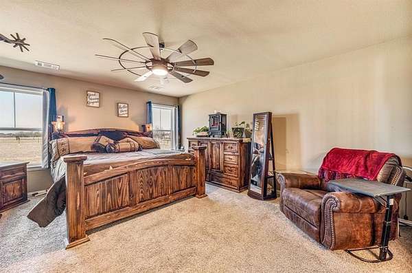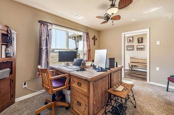 This custom 4-bedroom, 2-bathroom ranch style home on 10+ ag-exempt acres offers space, comfort, and versatility. The open-concept living, dining, and kitchen areas are perfect for daily living and entertaining. Features include custom cabinetry, copper sinks throughout the entire home, a spacious main suite with a luxurious bathroom, and a dedicated office. Fiber internet is already installed in the home. The attached 2-car garage is fully insulated with water hookups. Outdoors, enjoy a fully fenced yard, 3 cross-fenced pastures, established fruit trees, and a cozy covered back porch. The property also includes a 40x50 shop wired with 110 and 220 amp power, multi-port pneumatic system throughout, as well as, 30 and 50 amp RV hookups. The 12 ft. roll-up bay doors and 14 ft. ceilings in the shop make it perfect for a hydraulic lift, recreational toys and all of your farm equipment. The water well includes a water softener and iron filtration system. The 40' shipping container, on site, also provides more storage. The level land is ideal for agriculture, livestock, or outdoor activities, with room for a horse barn and roping arena. Located close to US 281, you are just 20 minutes from Tarleton State University and downtown Stephenville, and only an hour to Dickies Arena in Fort Worth.