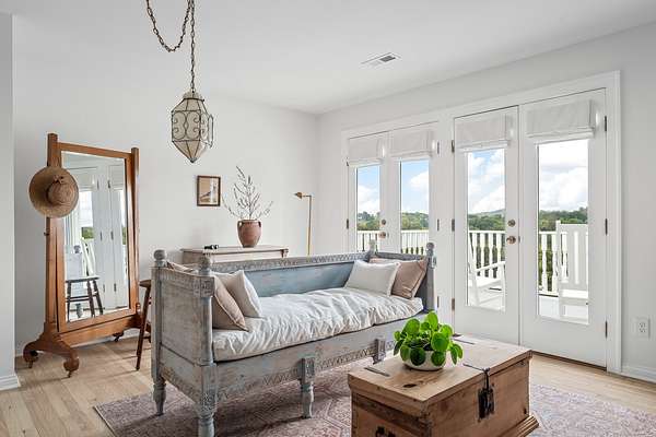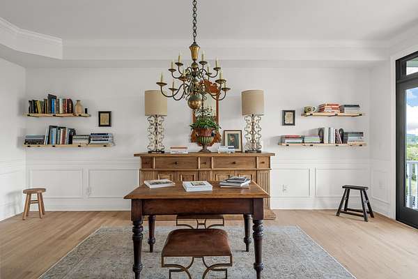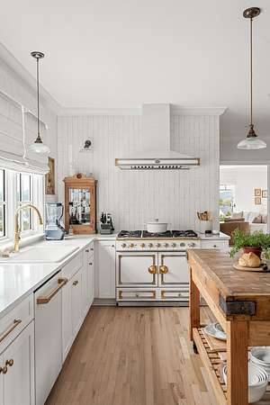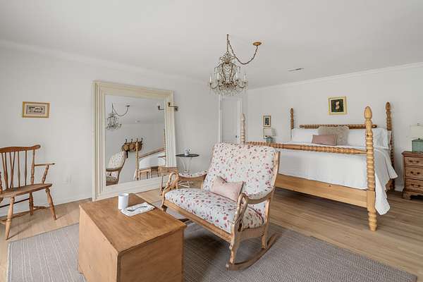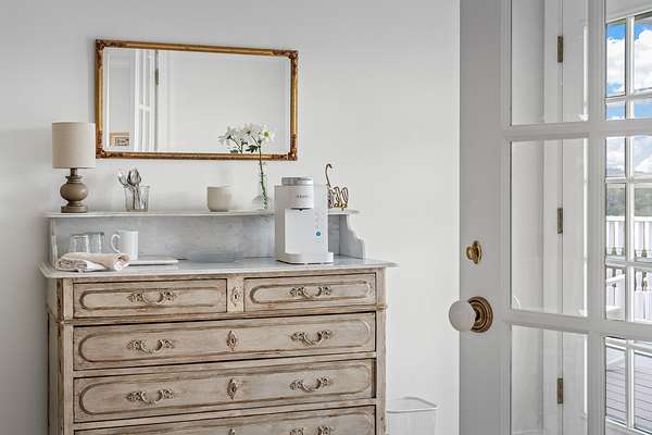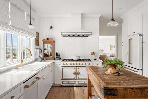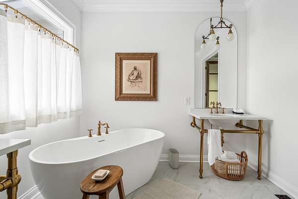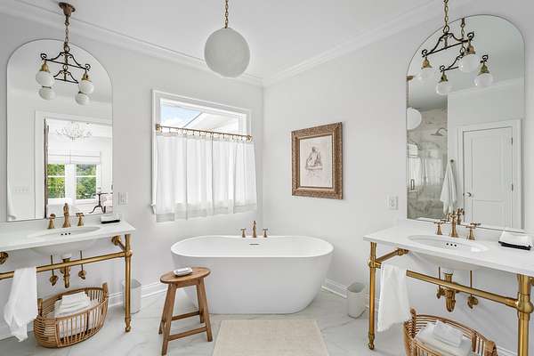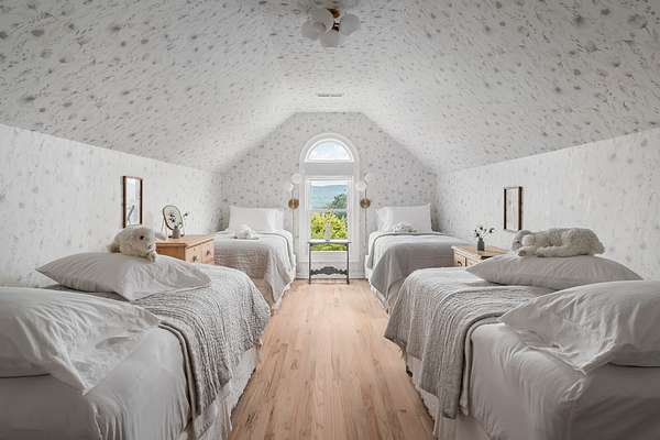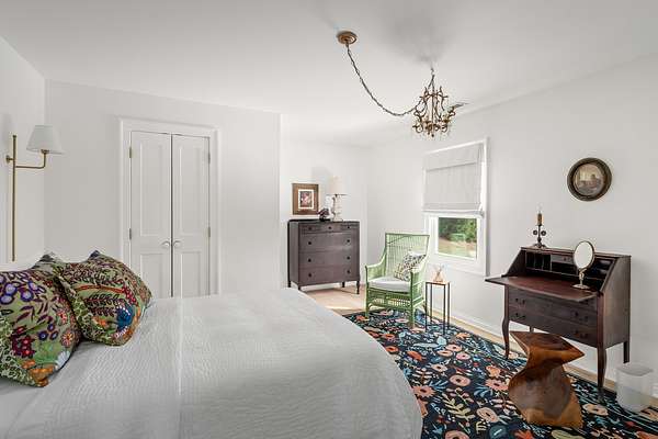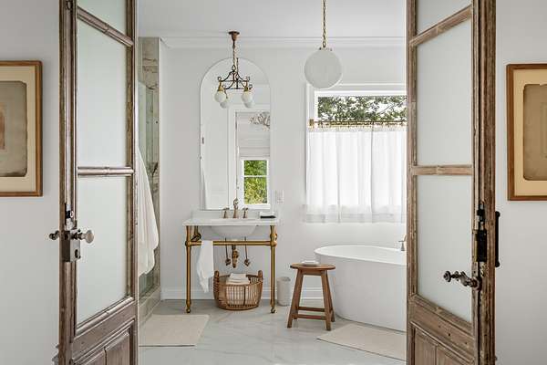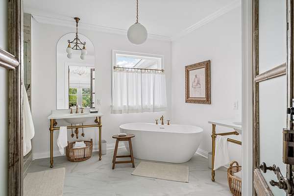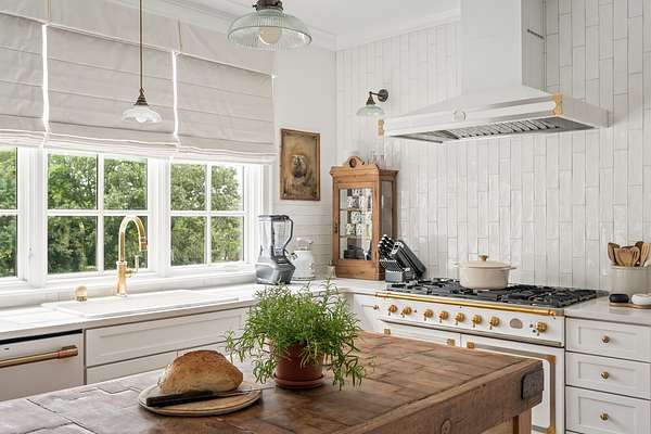 Throughout the residence, carefully curated choices elevate every room. European lighting fixtures not only illuminate but also serve as sculptural art pieces. Walls are dressed in rich designer wallpapers and paints, chosen to highlight the home's architecture and create distinct moods within each space. Functional kitchen with zelige tile, antique center island table and La Cornue stove The primary suite offers a private sanctuary, where design choices create an environment of relaxation and indulgence. Expansive windows frame serene views of the surrounding landscape, reminding you that this is a home deeply connected to its setting. The luxury hotel-inspired bathroom includes exquisite tile work, custom sinks, and fixtures chosen for both their beauty and enduring quality. Guest rooms carry forward the same level of intention. No corner of Idlewild feels like an afterthought; instead, each space has been curated to delight and welcome. With five bedrooms and 4.5 baths, there is ample room for family and guests alike.