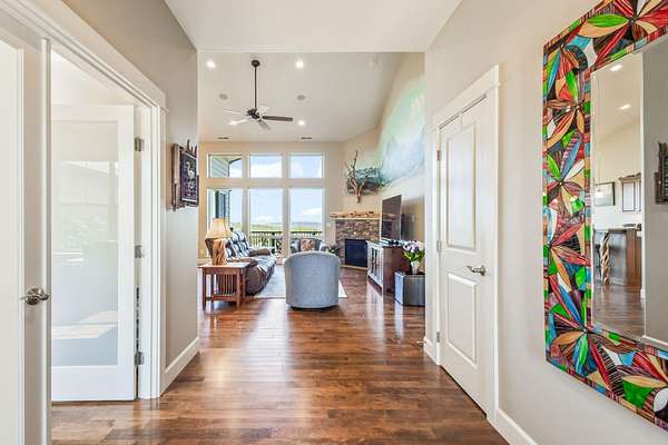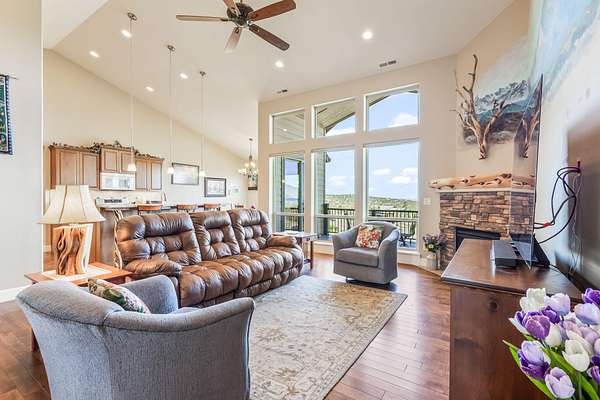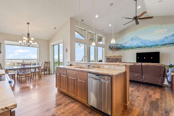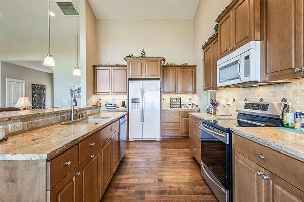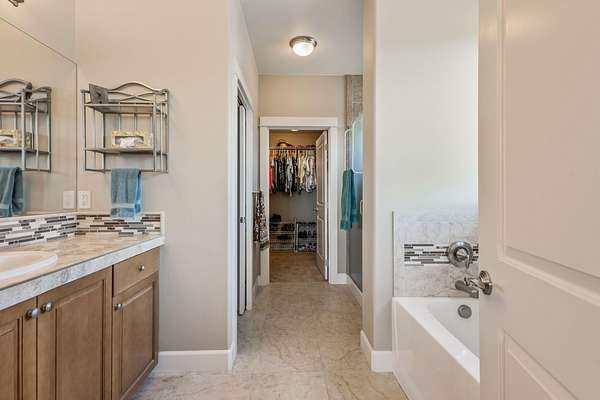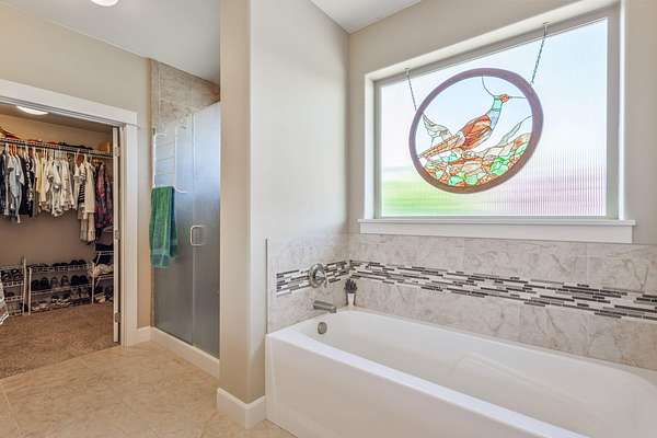 - Breakfast Bar, Ceiling Fan(s), Double Vanity, Enclosed Toilet(s), Granite Counters, Kitchen Island, Linen Closet, Open Floorplan, Pantry, Primary Downstairs, Shower/Tub Combo, Soaking Tub, Solid Surface Counters, Stone Counters, Tile Counters, Tile Shower, Vaulted Ceiling(s), Walk-In Closet(s)