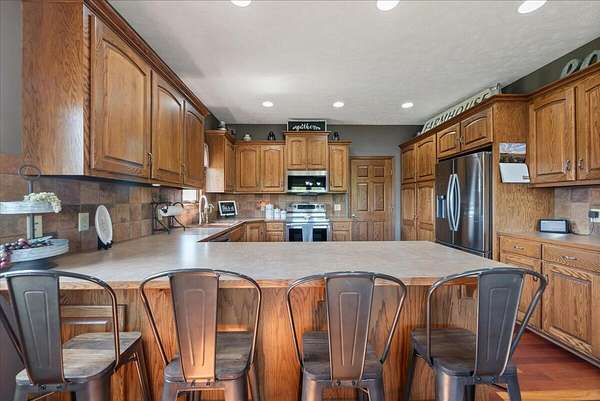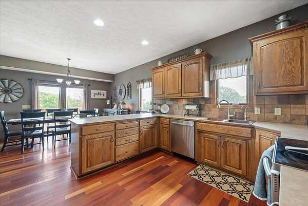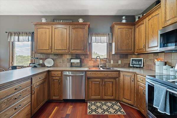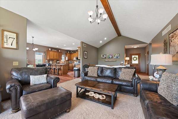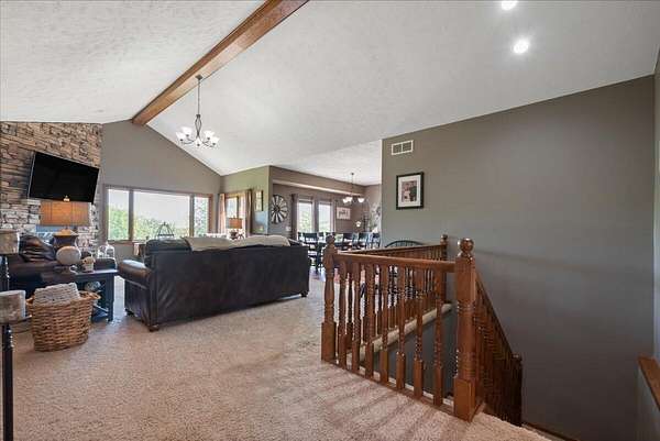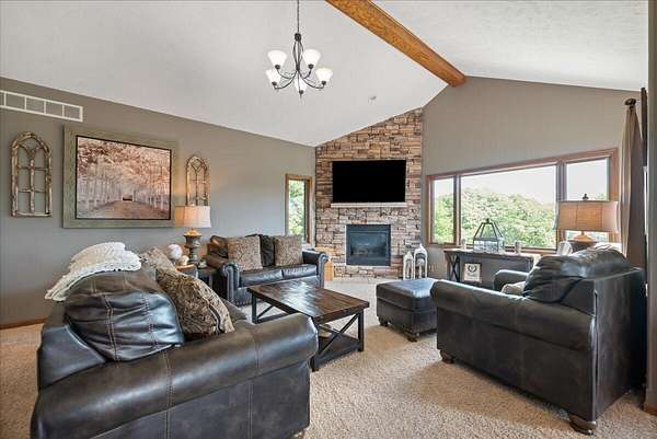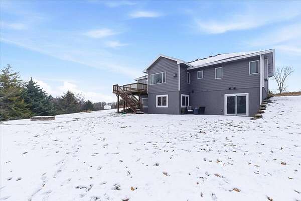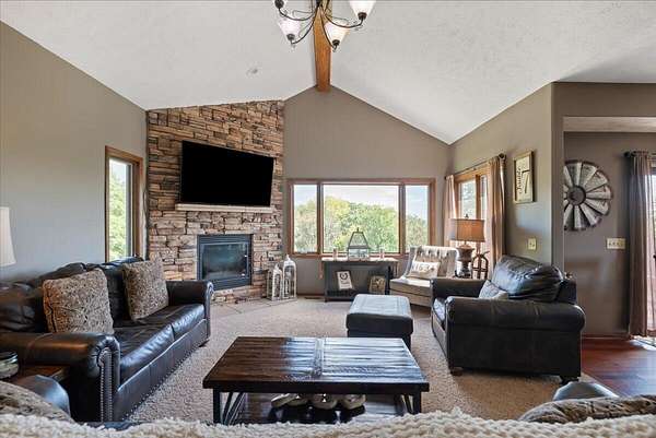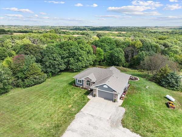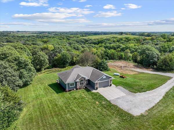 PRE-INSPECTED! Set on 13.48 acres, this custom home offers over 3,000 finished sq. ft., 4 bedrooms, and 4 baths, including 2 primary suites. The living room showcases vaulted ceilings, a towering stone fireplace, and a picture window with Loess Hills views. The kitchen features wood floors, oak cabinetry, stainless steel appliances, and a copper farmhouse sink with access to the deck. Main floor holds three bedrooms, including a spacious primary suite, while the finished walkout lower level offers a custom wet bar, open living area, and second suite with spa-like bath. Step outside to a patio, fire pit, and acres of timber for hiking, hunting, or relaxing. Updates include 2x6 walls, new septic laterals, tankless water heater, and water filtration system, and building pad for future 40x60 outbuilding. All just 9 miles S of Glenwood!