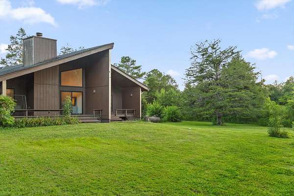 Poplar wood-paneled interiors and cathedral ceilings create a warm, open atmosphere. A signature centerpiece is the floor-to-ceiling double-sided rock fireplace serving both living and dining spaces.