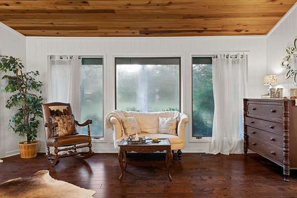 The master suite boasts its own wood-burning fireplace, attached bath, dual closets, and direct access via sliding glass doors to a covered private porch. Each bedroom enjoys its own outdoor retreat.