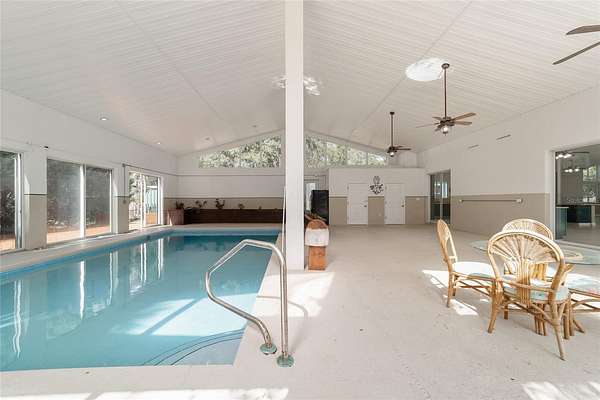 Welcome to one of the most unique and extraordinary properties on the market--nestled on 30+ private acres of scenic countryside! Only 14 miles to HITS, and 25 miles to the World Equestrian Center. This incredible estate offers over 5,300 square feet of living space, featuring a spacious 2-bedroom, 2-bath main home and an attached 3-bedroom, 1-bath in-law suite with a full kitchen. The open-concept design showcases soaring ceilings, expansive living areas, and a stunning library complete with a sliding bookcase ladder, custom moldings, large windows, and a grand fireplace. The private primary suite is generous in size, offering a walk-in closet, fireplace, luxurious jet tub, and oversized shower. The spacious kitchen includes solid-surface counters, double ovens, and plenty of workspace for the avid cook. Enjoy year-round relaxation and entertainment with the impressive indoor pool, boasting cathedral ceilings and an expansive deck area perfect for gatherings. Outside, the property features a mix of wooded and open pasture land, ideal for both recreation and equestrian use. The 6-stall barn includes two tack rooms, automatic waterers, fans, and matted stalls. Five 24x24 pole barns provide shade in various paddocks. Over 60 fruit trees dot the landscape, adding to the property's natural beauty. Additional amenities include a large insulated Quonset hut with HVAC previously used as dog housing - with several dog runs outside. The main home features two HVAC units plus one HVAC unit for the in-law suite - all replaced within the past five years. 2006 metal roof. There is a prewired generator setup - current generator is not functioning at this time. The main well features a 2023 well pump. There is an additional well on the property that is not currently being utilized.