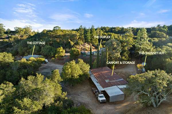 Welcome to Oak Knoll Ranch, a serene haven nestled just off the historic Stagecoach Road. This unique property offers a distinctive charm with its ample flat land, providing privacy from neighboring properties. Conveniently accessible, Oak Knoll Ranch provides an easy escape from the hustle and bustle of city life, with just a short 15-minute drive up the scenic 154 from Downtown Santa Barbara. With over 9 acres and 2 separate parcels... the possibilities are endless! This picturesque property is the perfect retreat for those seeking tranquility and seclusion nestled in nature. Oak Knoll Ranch is a rare gem, allowing you to experience the beauty of the outdoors without sacrificing accessibility. The artful design of the property harmoniously separates each space, providing a feeling of seclusion. Create intimate retreats within the distinct enclaves of the property, each with its own unique feel, while still enveloping all that Oak Knoll Ranch has to offer. The Duplex: 2 attached homes. The first side of the duplex is a 2-bedroom, 1-bathroom original home lined with gorgeous Douglas fir tongue-in-groove ceilings and walls, a retro kitchen, and two large picture windows looking out into the valley, making this the perfect cabin to be in nature. The second side of the duplex is a 1-bedroom, 2-bathroom home with an attached garage. The Quonset Hut: Creates the perfect workshop or art studio complete with concrete floors, corrugated metal siding, finished walls, overhead lighting, ceiling fans, 110 and 220-volt outlets, and a sink ready to be used with endless possibilities! The Cottage: A charming 2 bed + 1 bath second residence tucked in a private enclave of the property with its own yard and incredible valley views. This home features all the charm with a wood-burning stove, an enclosed patio, and even a little chicken coop! The 8 Car Garage: The 8 car garage has 8 bays on one side with large storage units on the other. Perfect for storing equipment, creating an outdoor workshop, or converting it into horse stables and an arena! 6480 STAGECOACH ROAD The Cabin: An old cabin sitting above the seasonal creek creates a picturesque platform for any artist's inspiration. The private well sits on this property, feeding both 6480 and 6572 Stagecoach Rd as well as neighboring homes. Enjoy the freedom to go completely off the grid with the possibility of implementing solar power solutions. The vast expanse of land provides ample space for creating your own horse arena and stables, catering to equestrian enthusiasts. Take advantage of the existing orchards filled with apples and pears, and cultivate your own garden in this idyllic setting. Whether you envision a private getaway, a self-sustainable lifestyle, or a combination of both, Oak Knoll Ranch offers a canvas for you to paint the lifestyle of your dreams. Embrace the tranquility, relish the freedom, and create lasting memories in this hidden retreat.