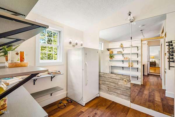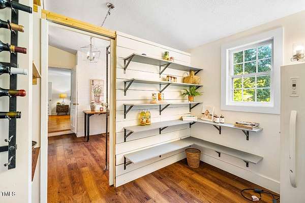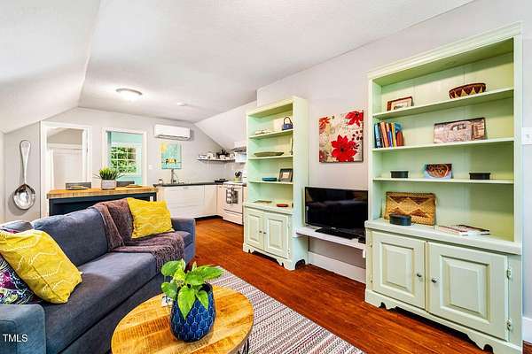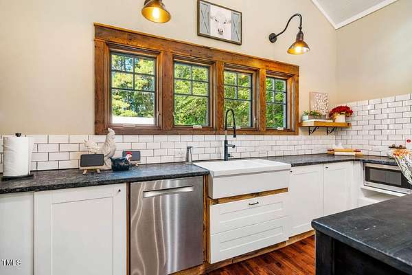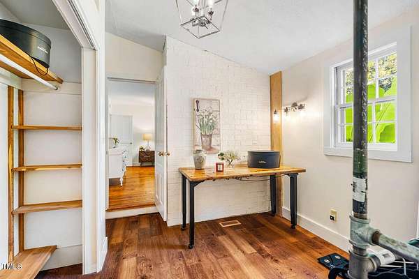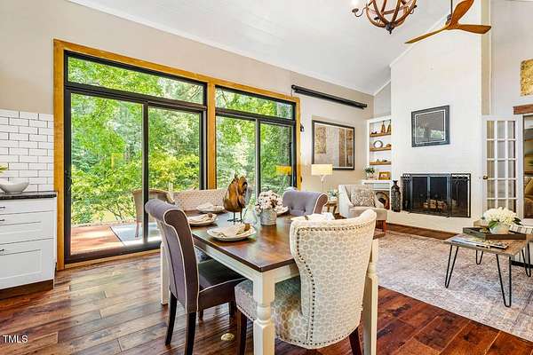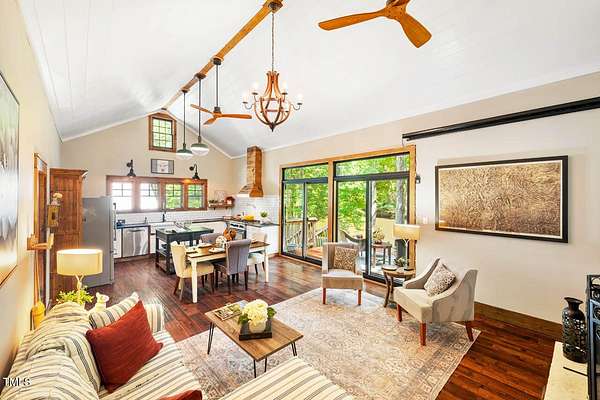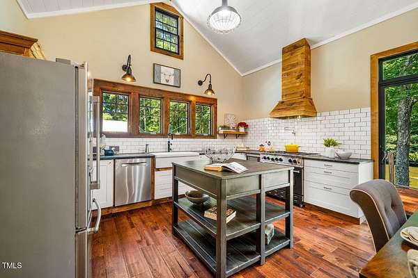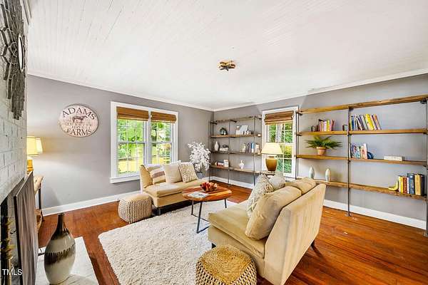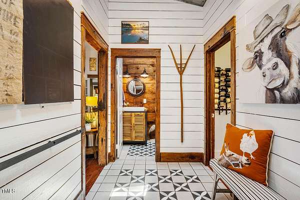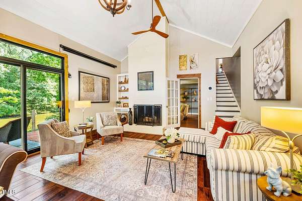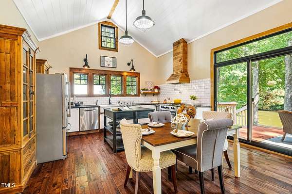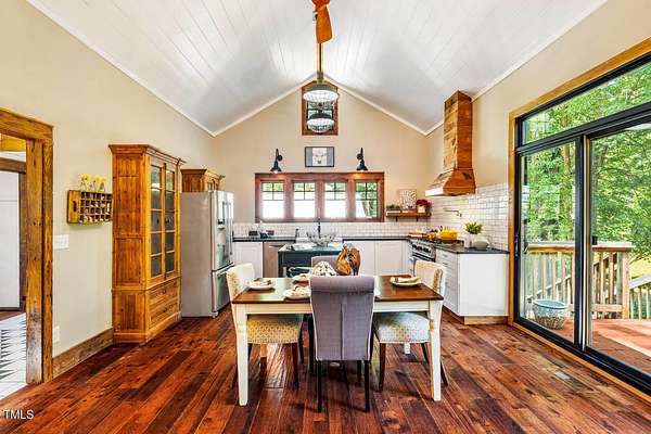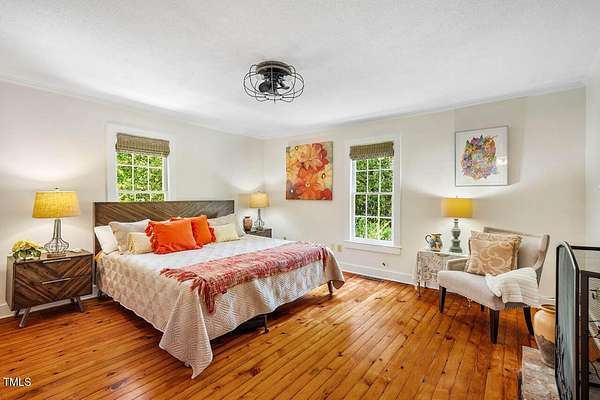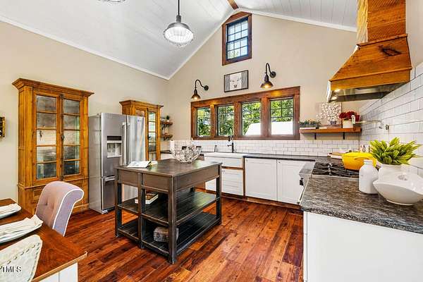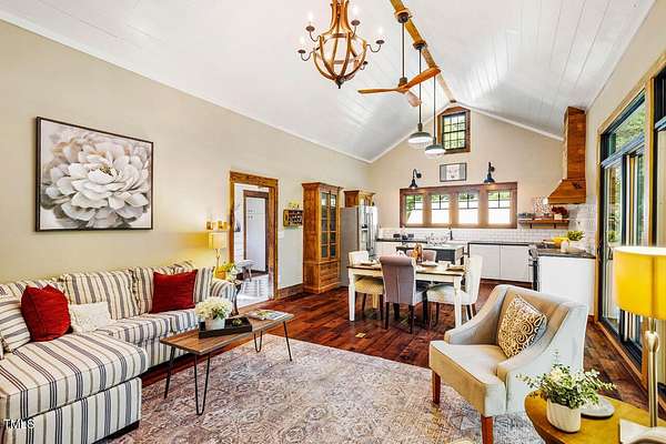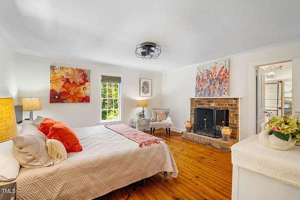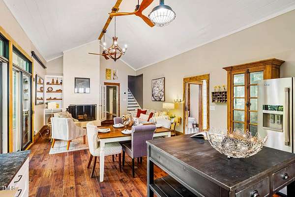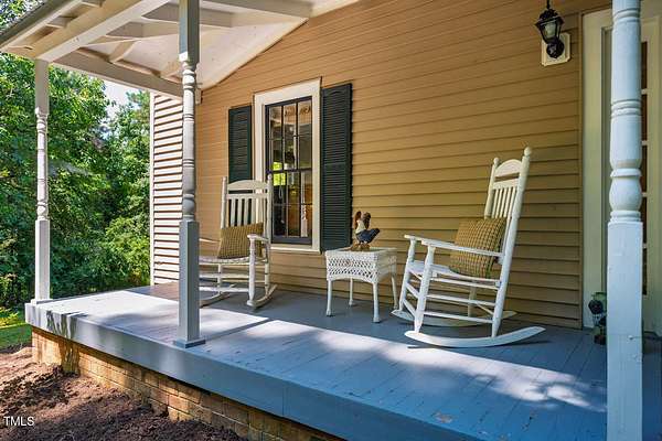 THE BEST OF BOTH WORLDS. The charm of a 19th century farmhouse on 7 acres and the convenience and utility of a remodeled barn which houses a temperature-controlled workout/project area, a workshop and a fully furnished one bedroom apartment, ready to rent or expand living area for family and friends. Rich in history, this impressive 19th-century farmhouse sits on a 7-acre home site with a pond view and retains the charm of yesteryear with heart-pine floors, spacious bedrooms, a rocking chair front porch and four masonry fireplaces, while offering the comfort of modern amenities. The impressive gourmet kitchen opens to the great room where you can enjoy dining and relaxing with water views while an additional flex room can work as a special dining room, tv room, library, or office space. The first-floor owners retreat hosts a masonry fireplace, separate bathroom, large walk-in closet/dressing room. Upstairs you will find another bathroom and 2 large sunny bedrooms, one with a masonry fireplace. The home/barn is enhanced with a tankless water heater, geothermal heat and a newer roof and new mini-split cooling system in the barn. Ideally located between UNC Chapel Hill, the renowned Farrington Inn and the up and coming downtown Pittsboro, this home is perfect for outdoor lovers who will enjoy the garden areas, scenic deck view with no neighbors in sight and also those who love historical properties or have a creative flair to make use of the generous barn space work areas. In the 1960s the Jones family brought the home to Chatham County to start a new life. Let this be part of your story. House: 3 bedrooms,2.5 baths, Apartment 1 bedroom/1bath. Bonus: no HOA, Over 1100 sq feet of heated/cooled space and an additional 555 sq feet in the barn for all expansion at this exceptional property.