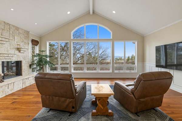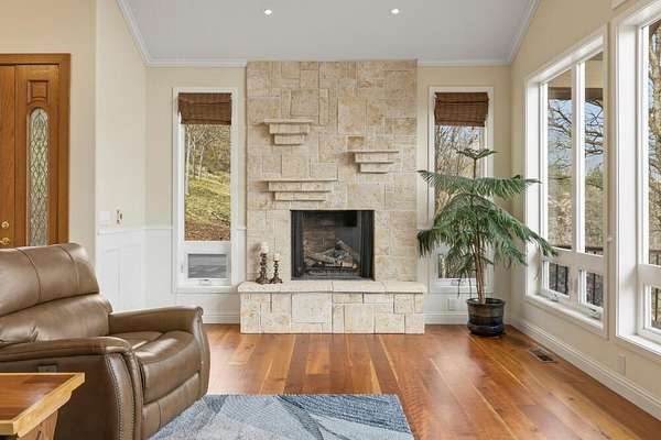 RUNNING Y ESTATE - WATER VIEW ON 2.65 ACRES - LIVES LIKE ONE LEVEL WITH THE LUXURY OF AN ELEVATOR! Combining privacy with a panorama of views, plus 4 en-suite bedrooms - just imagine yourself enjoying the lifestyle of the Running Y Resort in this quality 3,265 SF home. Main level has easy access and boasts freshly painted great room with amazing lake views, gas fireplace, primary suite with more views, luxurious bath with both shower and jetted tub. The spacious kitchen has large island, abundant counter space, and storage plus high-end appliances and yes - more views! Lower level includes 3 en-suite bedrooms, wine storage, office and flex space. Flexible rooms include an office with built-ins and a sun/plant room with exterior door. Easily accessible storage under the home is the perfect place for holiday decorations and more! Both front deck and rear patio space offer outdoor living options. Easy to show!