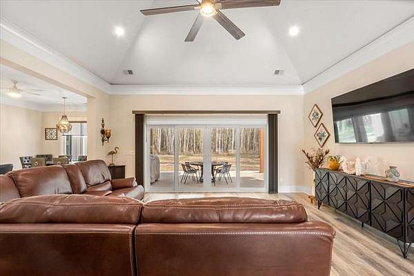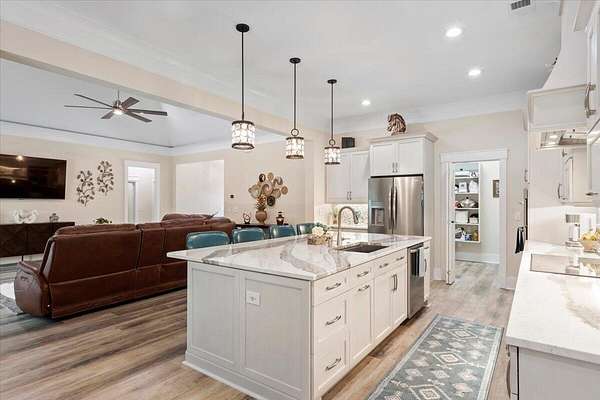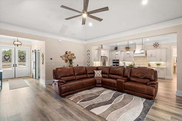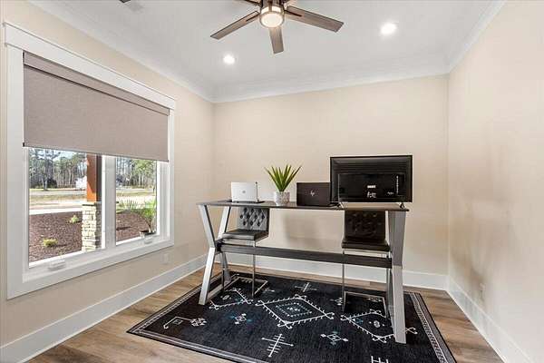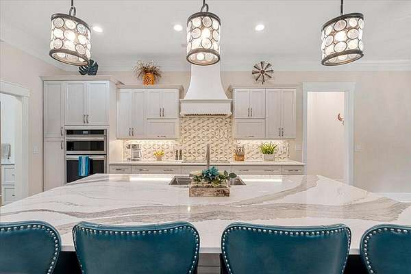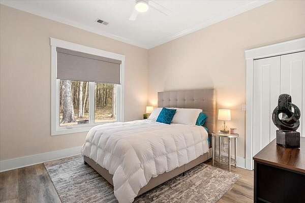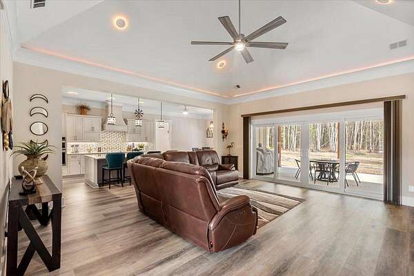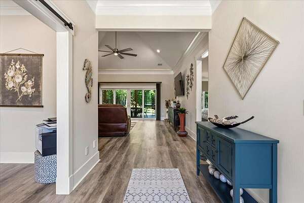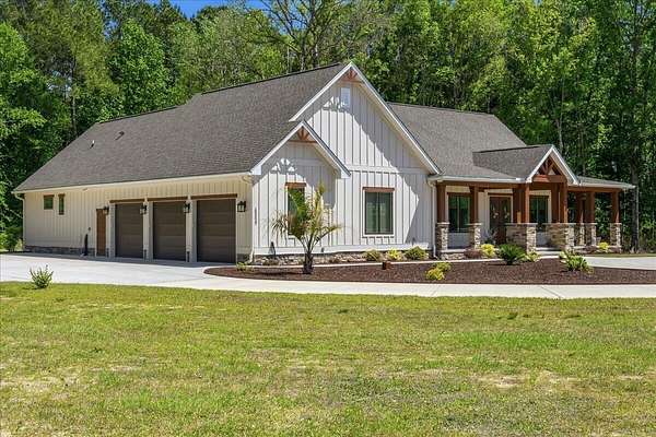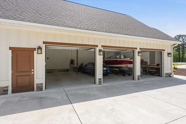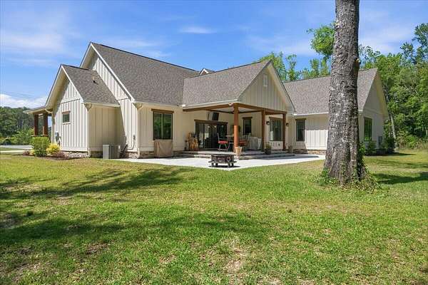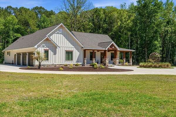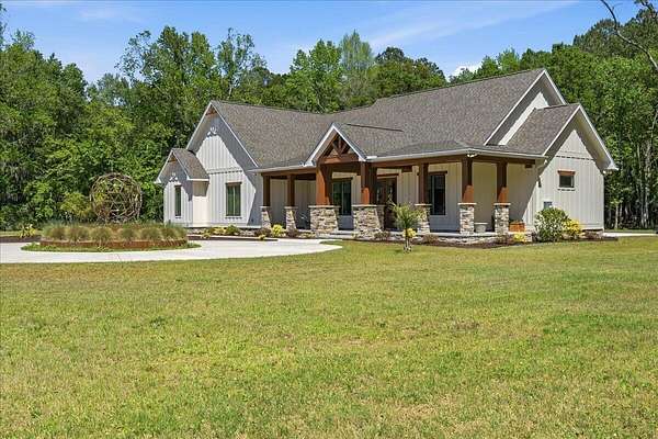 Welcome to refined Lowcountry living in this beautifully crafted 2022 one-level Modern Craftsman ranch, where timeless design meets thoughtful luxury on nearly 3 private acres. A sweeping circular drive and expansive parking pad welcome you home, framed by professional landscaping and a charming architectural presence highlighted by board-and-batten siding, natural sandstone accents, and wood porch ceilings supported by impressive columns. Inside, the home unfolds into a bright, open-concept layout where a soaring cathedral ceiling and layered crown molding define the great room, enhanced by soft ambient lighting and wide-plank wood flooring that flows seamlessly throughout the main living areas. Designed with both beauty and function in mind, the chef's kitchen features anoversized quartz island, custom soft-close cabinetry, marble mosaic backsplash, and a full suite of premium appliances including an induction cooktop and convection oven with air-fry capability. A walk-in pantry and stylish dry bar with wine storage and beverage cooler elevate everyday living and entertaining alike. The owner's suite is a true retreat, showcasing a cathedral shiplap ceiling, serene lighting, and a spa-inspired bath complete with dual vanities, an oversized tiled walk-in shower with frameless glass, and custom his and her separate walk-in closets. Two additional spacious bedrooms share a well-appointed Jack-and-Jill bath, while a dedicated office with a designer barn door provides the perfect work-from-home space. Every detail has been carefully considered from the tankless water heater and high-efficiency HVAC system to the whole-home central vacuum, integrated security system, and hardwired Wi-Fi access points for seamless connectivity. The oversized finished garage offers exceptional versatility with boat parking up to 26', tandem parking, high ceilings, utility sink and workbench. The outdoor living is just as impressive, featuring a large rear tabby shell patio with gas connection for a future hot tub, ideal setting for quiet morning coffee, connecting to nature or evening gatherings. With expansive open space, the possibilities are endless. Design your dream outdoor oasis with room for a pool, garden or fully fenced yard. Beautifully designed landscape beds, and a unique geodesic garden feature that adds character, charm and incredible curb appeal. Zoning allows for an accessory dwelling (ADU), a 67ft x 42ft concrete parking pad that accommodates 10 vehicles, several boats or an RV. No flood insurance required, no HOA or CCR's. A rare opportunity to own a meticulously crafted and well maintained home that perfectly balances rural privacy and urban conveniences. Just minutes to Mt. Pleasant, shops, dining, and beaches. AGENT IS OWNER.