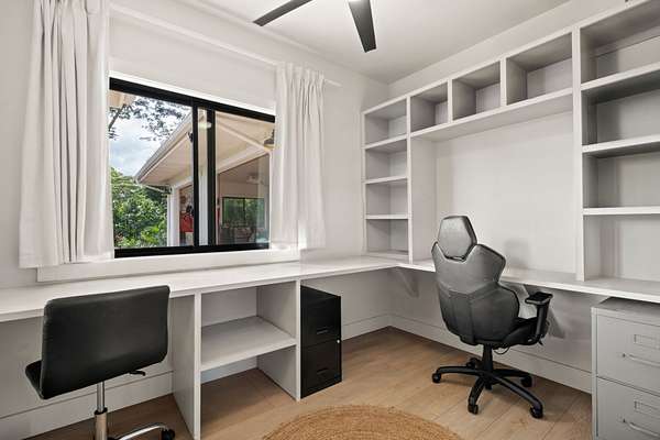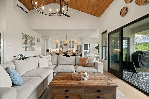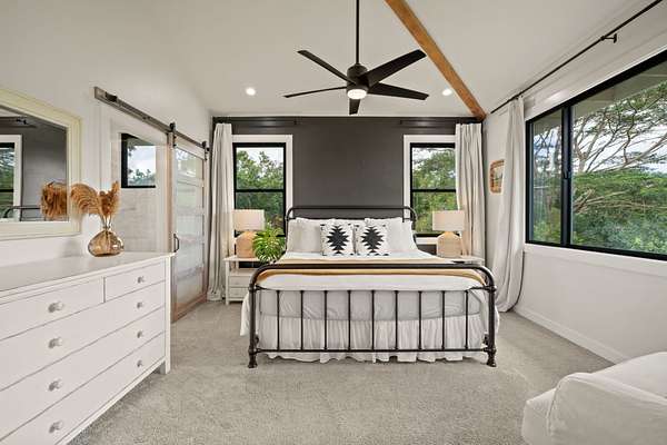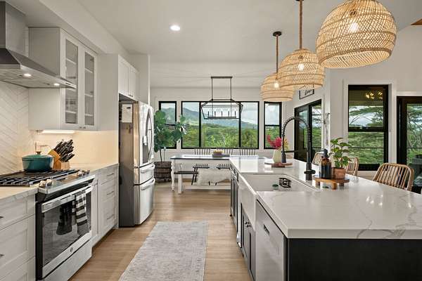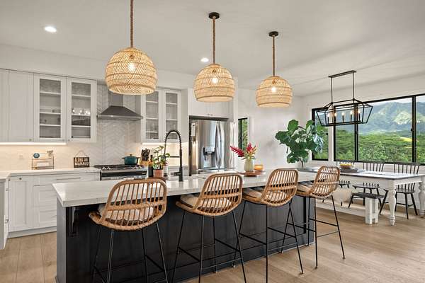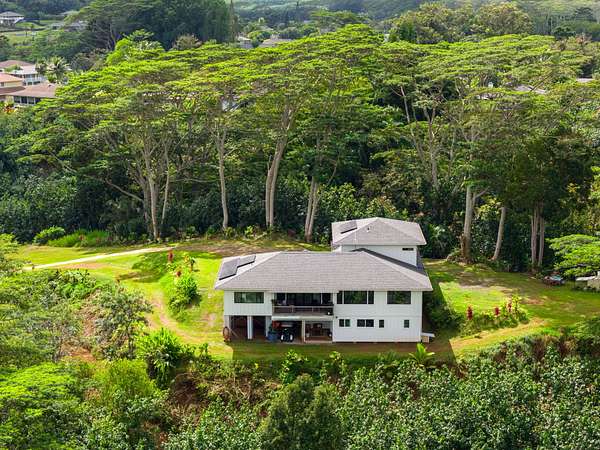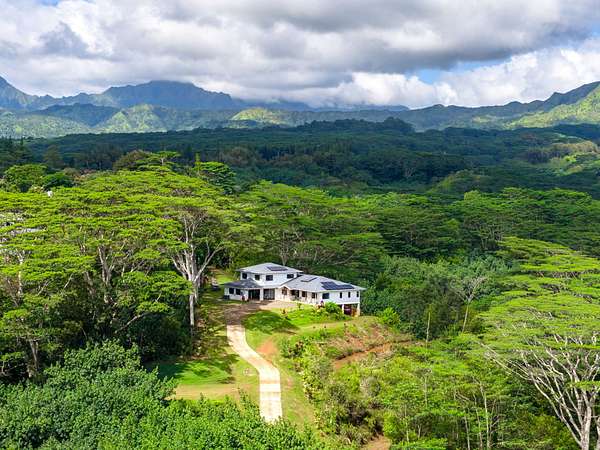 Perfectly situated on an idyllic private mountaintop in Wailua Homesteads, this stunning well designed 6 bedroom, 4.5-bath custom residence captures the essence of island living with breathtaking panoramic views of the mountains and the blue pacific ocean. Designed to blend luxury with tranquility, the home welcomes you with open-concept living spaces, soaring ceilings, and expansive glass doors that frame the natural beauty in every direction. The gourmet kitchen features premium appliances, an oversized island, walk in pantry and seamless indoor-outdoor flow for entertaining. Relax at the dining table with majestic valley and mountain views or enjoy outdoor dining on the beautifully appointed lanai. The main entry floor consist of 4 bedroom 2 and one half baths plus a separate office. Large laundry / mud room area with sink and a separate entrance. The primary suite offers a sanctuary of its own, complete with dual sinks, large walk in shower, and views in every direction. The second floor offers nearly 700 sf of living area with a separate entrance, a private bedroom and kitchen area. There is a really cozy room on the lower floor with its own entrance as well. The casual beach vibe decor carries the day throughout the entire residence. Step outside to enjoy the lanais, lush landscaping, and gentle mountain breezes. Whether hosting gatherings under the stars or simply unwinding in peaceful solitude, this home offers an unparalleled lifestyle above it all. Experience the perfect harmony of nature and luxury mountaintop haven where every day feels like a private escape.