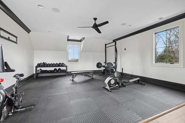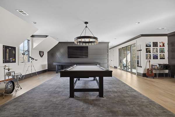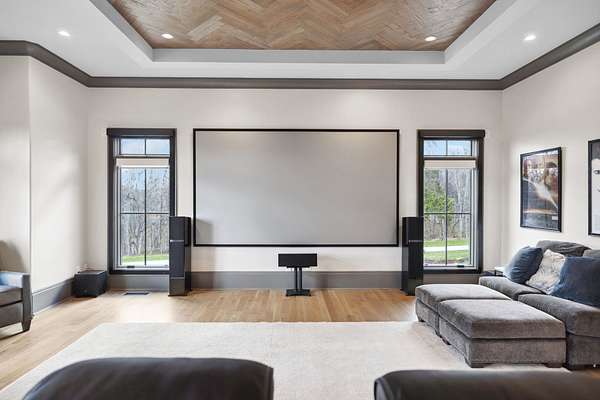 Entertainment abounds with a state-of-the-art media room featuring a 180-inch projector screen, surround sound, blackout shades, and a kitchenette. Upstairs offers a game room, gym, bunk room, walk-in storage, and three en-suite bedrooms.