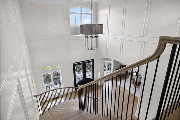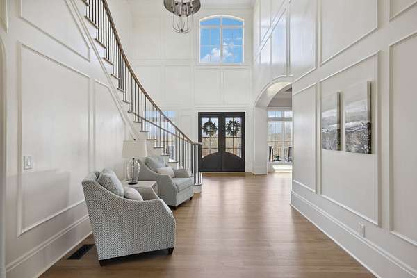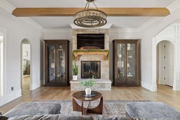 Step through grand double doors into a breathtaking two-story foyer with a gracefully curved staircase and custom wainscoting. The main floor boasts 12-ft ceilings, rich hardwood floors, and an inviting family room with wood beams, a wood-burning fireplace, Bluetooth surround sound, and sliding doors to the covered back porch.