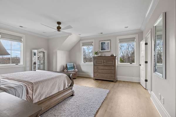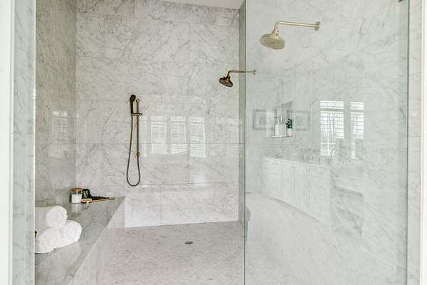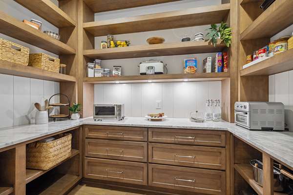 The gourmet kitchen is a chef's dream, featuring custom cabinetry, double ovens, a gas range, Thermador appliances, a wood-paneled refrigerator, an oversized island, two Bosch dishwashers, and a hidden pantry with an Elkway water dispenser and abundant storage.The luxurious owner's suite showcases vaulted wood-beamed ceilings, a Davinci Collection fireplace, and a spa-like en-suite with a free-standing soaker tub, a grand luxury shower with a spa water system, and a private laundry-equipped custom closet. A guest suite and executive office with a hidden safe and private access to the owner's suite complete the main floor.