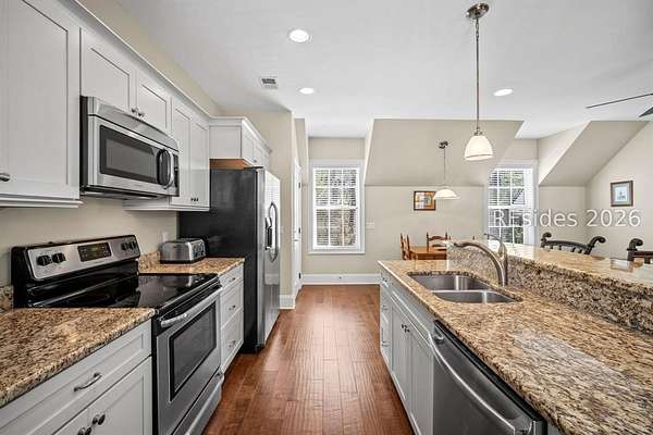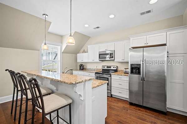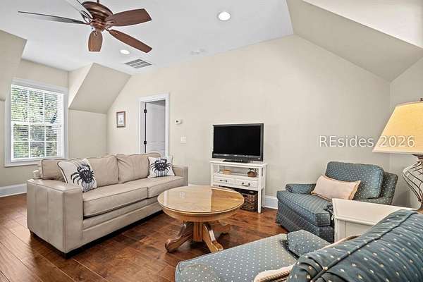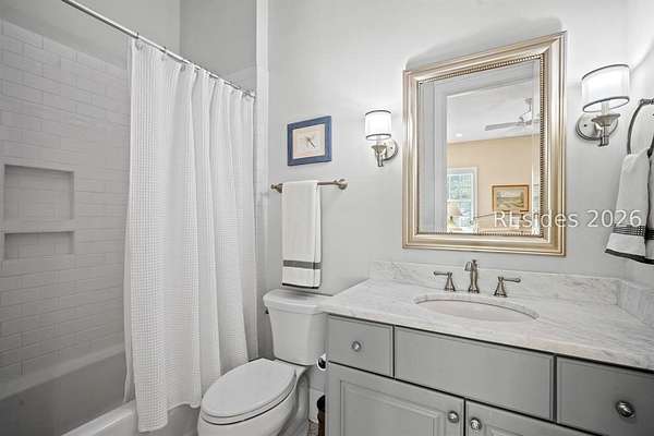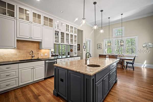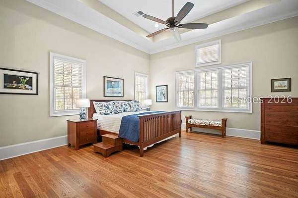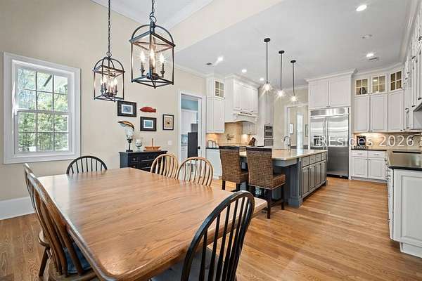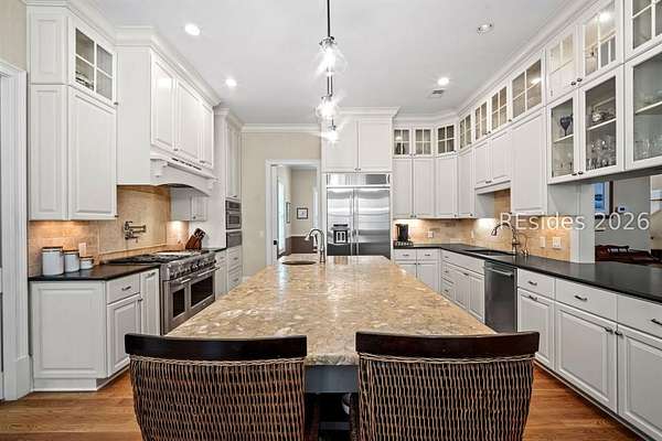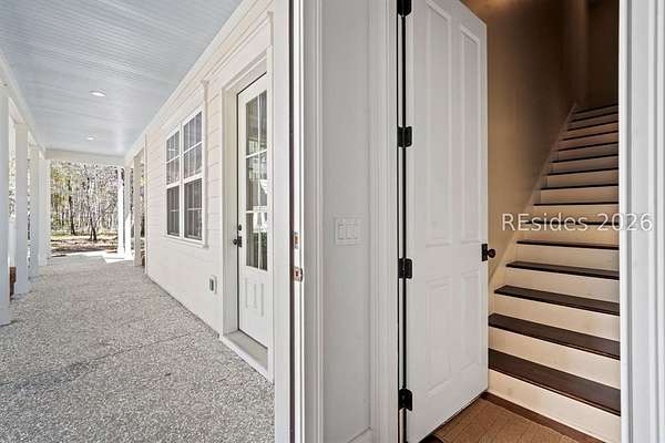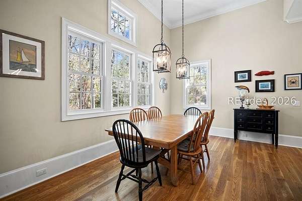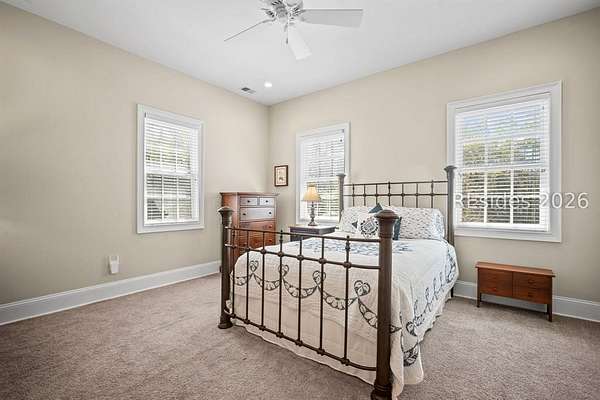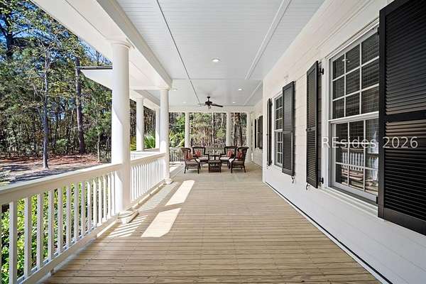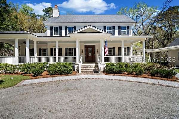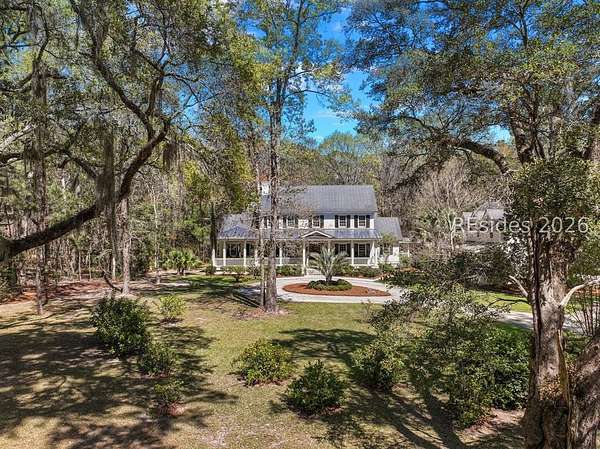 Tucked away on nearly three wooded acres, this gracious Southern estate at 66 Heyward Point Drive offers timeless charm, privacy, and inviting spaces designed for relaxed Lowcountry living. From the moment you arrive, the expansive front porch sets the tone, perfect for rocking chairs and morning coffee. Inside the main home, beautiful oak floors flow throughout warm, traditionally styled interiors that feel both comfortable and refined. The kitchen is the heart of the home, featuring a large central island ideal for gathering, meal prep and entertaining, along with a double oven and gas range-perfect for the home chef. Thoughtful details and abundant natural light enhance every room, resulting in a home that is welcoming, well-balanced, and timeless in character. The home's porches truly steal the show. In addition to the generous front porch, the large screened back porch overlooks the peaceful, wooded setting-an ideal spot for outdoor dining, evening breezes, or simply enjoying the quiet surroundings year-round. The main residence offers three large bedrooms, a den/office, formal dining room, open family room, large pantry, and laundry room. The detached three-car garage includes private living quarters complete with a full kitchen, dining and sitting area, and an additional bedroom for guests, extended family, or a personal retreat. The workshop, adjacent to the garage, adds excellent functionality for hobbies, storage, or projects. Outdoors, the estate property continues to impress with Live Oaks, mature trees, a shed, and ample space to enjoy nature, garden, or expand outdoor living. (A pool plan has been approved by the ARB). This is a rare opportunity to own a classic Southern home that blends comfort, character, and space in a serene Lowcountry setting.