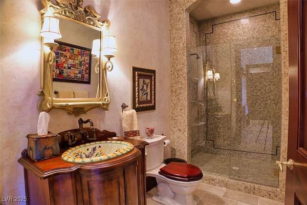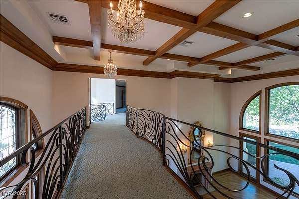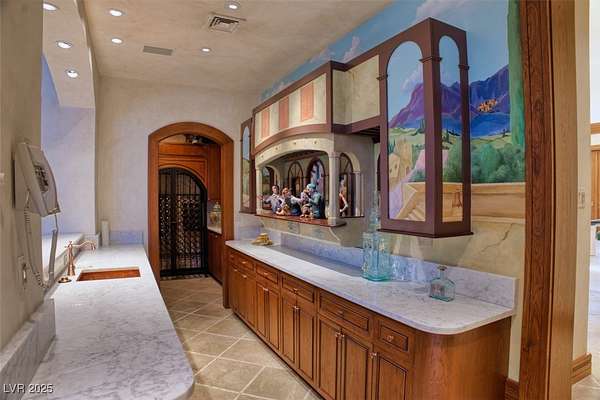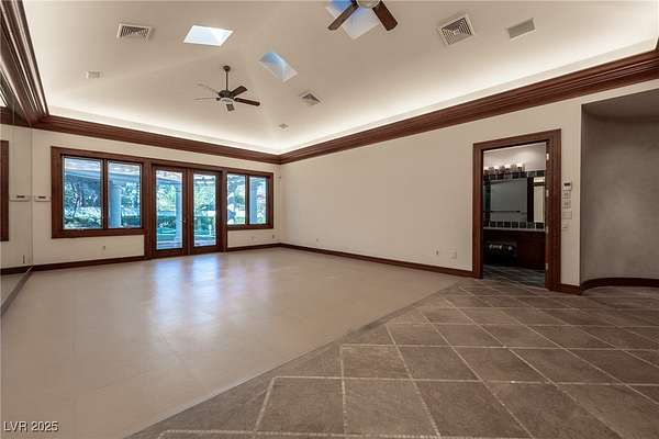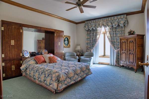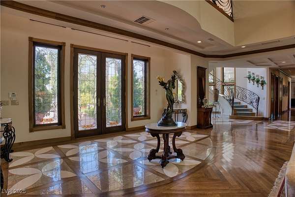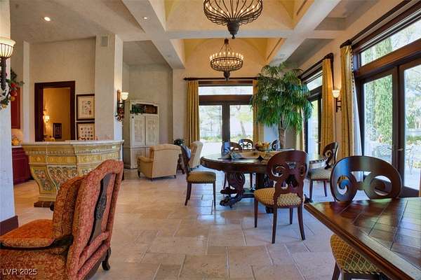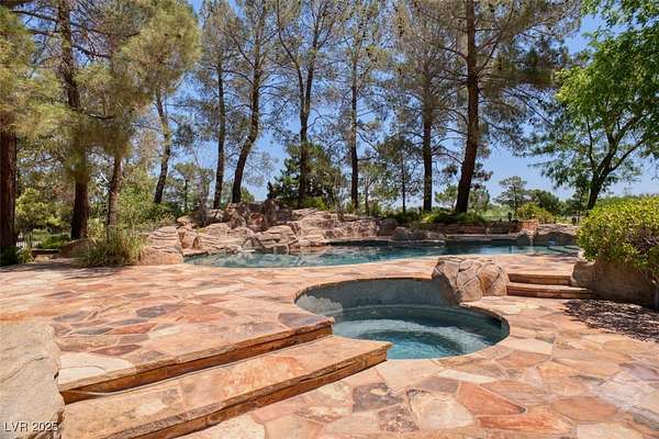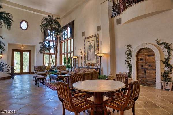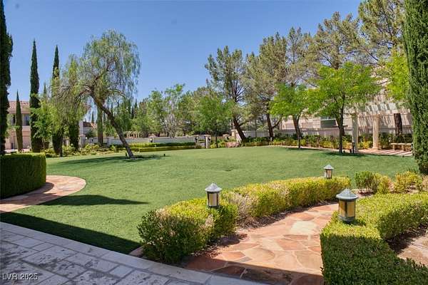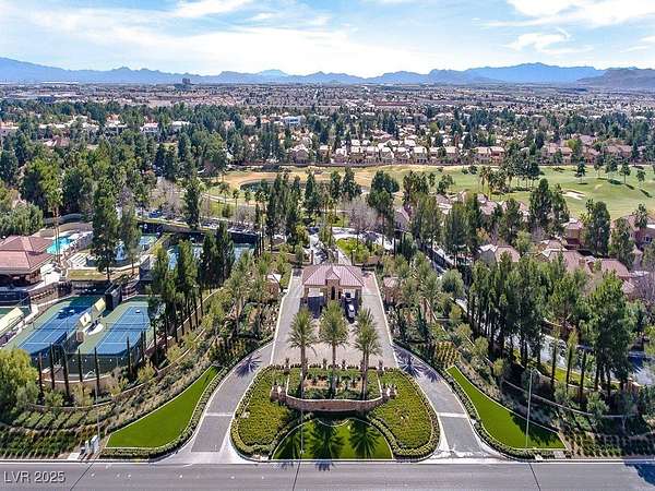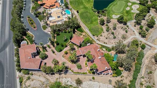 IMPRESSIVE TRIPLE GATED PROPERTY WITHIN THE GROUNDS OF 24 HOUR GUARD GATED SPANISH TRAIL GOLF AND COUNTRY CLUB. 27 HOLE PRIVATE GOLF COURSE. THE PROPERTY CONSISTS OF 1.6 ACRES OF LUSHLY LANDSCAPED GROUNDS WITH A POOL/WATERFALL AND TWO SPAS. RUNNING STREAM, OUTDOOR FIREPIT AND ROSE GARDENS OVERLOOKING 4 FAIRWAYS, LAKE/WATEFALL/MOUNTAIN AND SUNSET VIEWS. THIS INCREDIBLE FAMILY COMPOUND MAIN HOME IS APPROXIMATELY 10,300 SQ FT WITH EXQUISITE DETAIL THROUGHOUT. 1 BEDROOM DOWN, 2 BEDROOMS UPSTAIRS EACH WITH ITS OWN BATH AND BALCONY. ART ROOM PLUS LARGE DEN/OFFICE. 3 CAR OVERSIZED DRIVE THROUGH GARAGE. SEPARATE 1,200 SQ FT PARTY/TEA HOUSE OFFERS AN INTRICATE COFFERED CEILING. 5,100 SQ FT GUEST/CARRIAGE HOUSE HAS A 5 CAR GARAGE. GYM/WET BAR/WINE ROOM. THE COMPOUND CONSISTS OF 5-6 BEDROOMS, 7 FULL BATHS PLUS 2 HALF BATHS. 8-10 CAR GARAGES. 15 MINUTES FROM THE LAS VEGAS STRIP, AIRPORT AND LAS VEGAS RAIDER STADIUM. TOTALLY 16,600 SQ FT