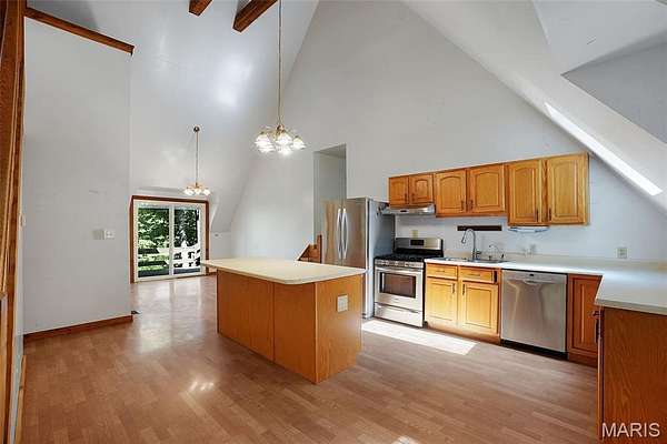 - Beamed Ceilings, Ceiling Fan(s), High Ceilings, Kitchen Island, Kitchen/Dining Room Combo