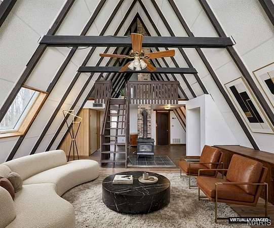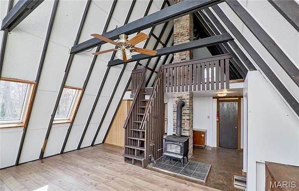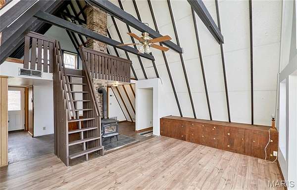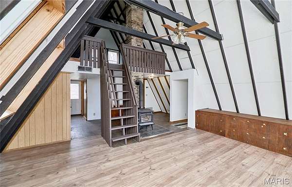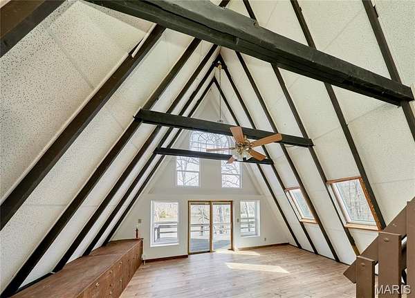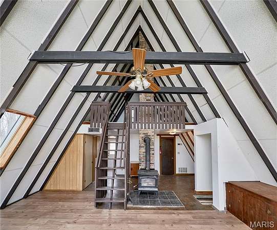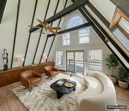 Private lake retreat just outside of town on 3.5 acres near the State Park! This 3BR/2BA double A-Frame home offers beautiful views, numerous updates, and plenty of opportunity to make it your own. The wrap-around deck overlooks the lake, creating the perfect setting to relax and enjoy the peaceful surroundings. The property also includes an outbuilding for storage and a chicken coop, ideal for those wanting a small homestead lifestyle. The main level features an open floor plan with wood beams, ceiling fan, and abundant windows that fill the home with natural light. A door from the living area leads directly to the deck, making it easy to enjoy the scenery. The remodeled full bath connects to the primary bedroom and includes dual sinks, jetted tub, and separate shower. The original section of the home offers a second vaulted living area with wood beams and a cozy wood-burning stove, plus additional access to the wrap-around deck and lake views. Upstairs, the loft area and second full bath provide flexible living options, perfect for a growing family, guest space, or potential in-law quarters. Enjoy privacy, nature, and lake views while still being conveniently located near town. The original A frame part of the home was built in 1968 and the newer A frame part is near 2005. Seller selling property "As Is".