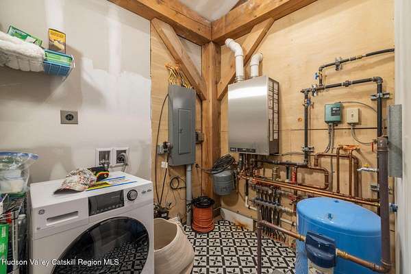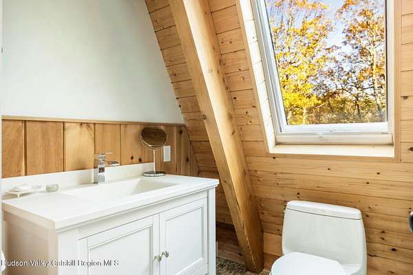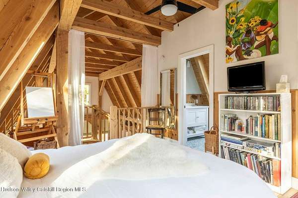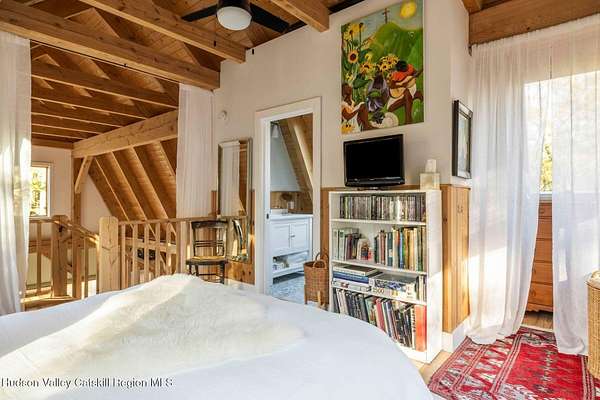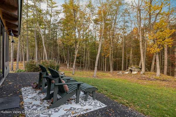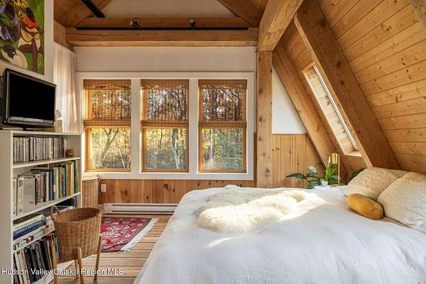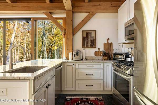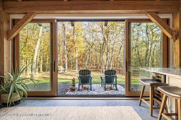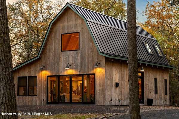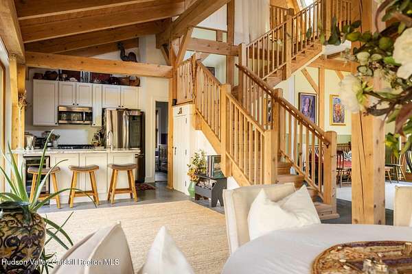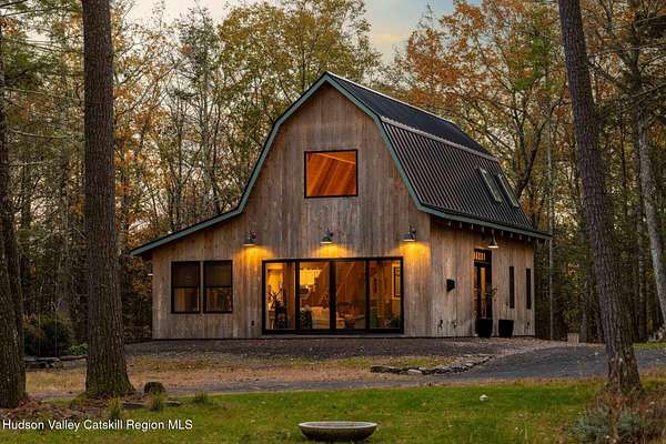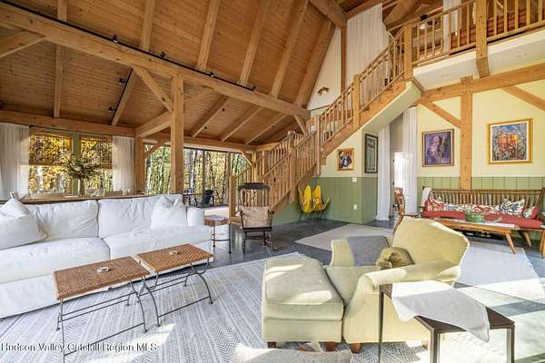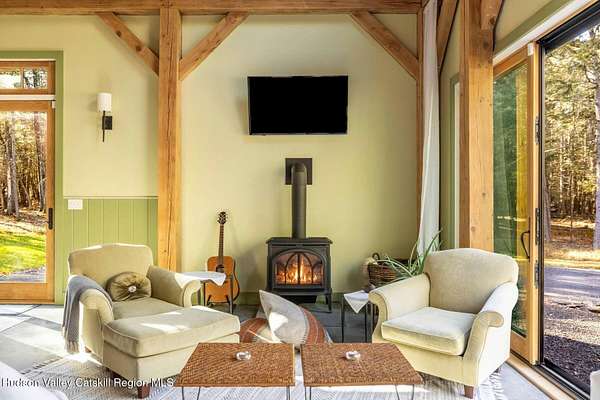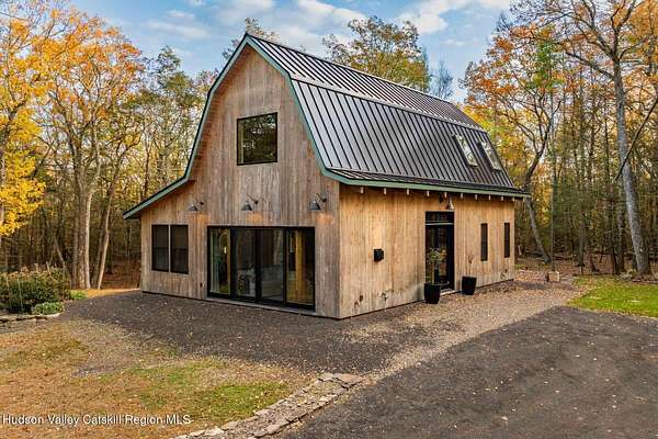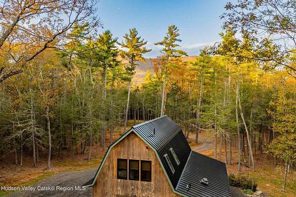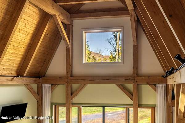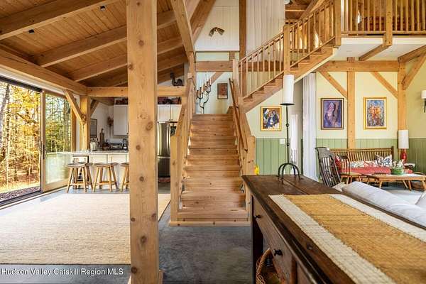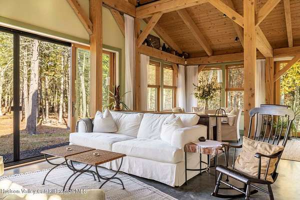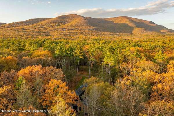 So close yet so far away! Walk to town from your totally private and like-new timber frame home with soaring 23-foot ceilings and walls of windows to bring nature in. As you enter from one of Woodstock's most coveted roads, through the stately pillars, you will feel a sense of tranquility with nature on this 9.94-acre lot that is just a half mile from the village of Woodstock and less than a half mile from the iconic Levon Helm barn. As you follow the curve of the driveway and the glacial bluestone outcropping deposits rising from the meadow, this elegantly sited Harvest Moon timber frame home blends seamlessly with the trees with its black metal roof and natural wood siding. Through the old timber you can even see peeks of Overlook Mountain that could be expanded. Experience elevated eco-conscious living in this architecturally stunning timber frame home, built in 2021 with sustainability and style at its core. This 2-bedroom, 2-bath residence showcases soaring ceilings, exposed timber framing, and an open-flow layout that celebrates natural light and craftsmanship. Designed for year-round comfort, the home features radiant floor heating, sun lamps in both bathrooms, a towel warmer, and a cozy gas heating stove. The chef's kitchen is a true centerpiece-perfectly appointed for entertaining or quiet culinary moments, with premium finishes and thoughtful design. Located just a short walk from the artistic heart of Woodstock, this home blends green living with cultural vibrancy. A rare opportunity to own a refined retreat where luxury meets sustainability. A 3D Walkthrough Tour is available in the digital Lookbook or by request.