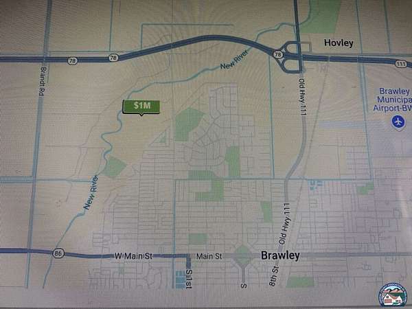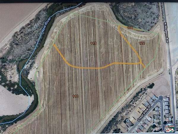 Est $6,675/mo92.8 acres Ranch located off of Western Ave, just south of the CA-78, bordering the New River and Ridge Park Subdivision. Fertile soil: 58% Holtville silty clay, 32% Imperial-Glenbar,and 9% Meloland (see soils map and tile map attached). Good hay ground with long term tenant history. (current lease up for renewal Jan 2026). Good for other crops as well. Zoned A2 with urban overlay, 1 parcel also has geothermal overlay. Ranch is less then 1 mile from IID Parkview substation with high grid power poles across the street on Western Ave. .